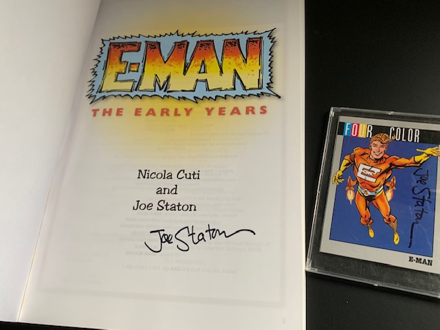 A large E-Man display! I started heading over that way to take a look, and found out that the artist & co-creator of one of my earliest superheroes, Joe Staton, was there with copies of a collected edition published by 1First Comics!