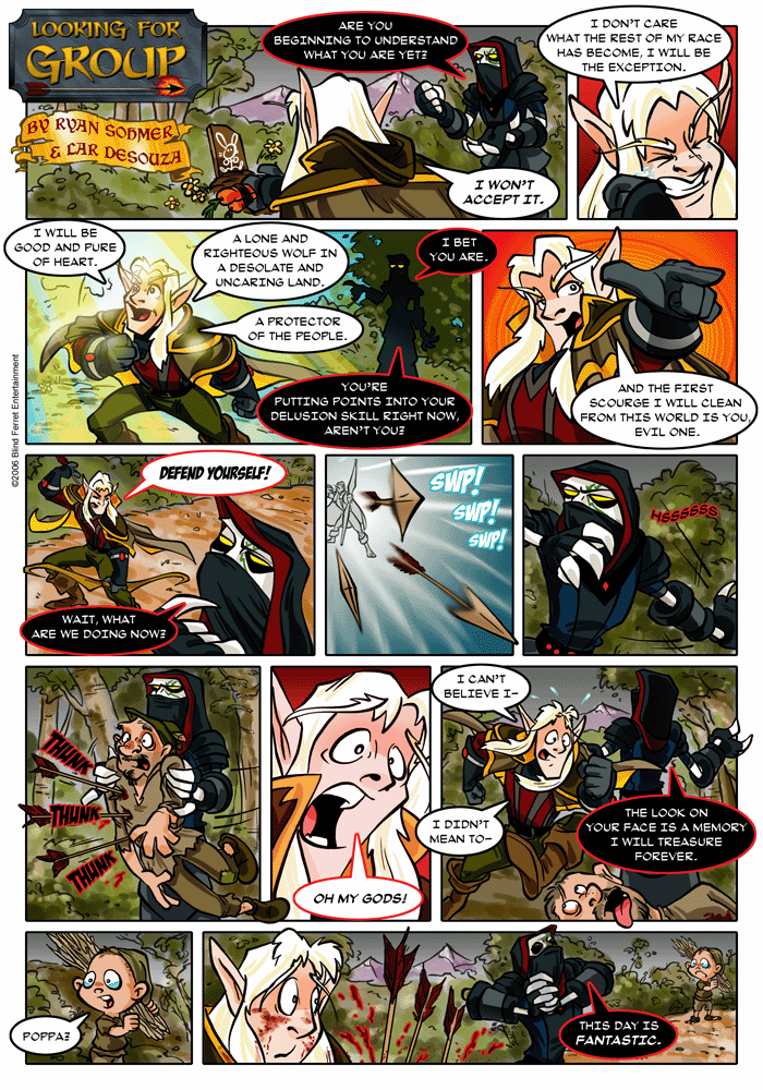 Looking For Group follows the adventures of Cale’Anon the elf and Richard the undead warlock, as well as their companions, through Fantasy, Pop Culture, and Gaming tropes, set in a reality and time unlike our own. It’s a place where the eating of small children is not necessarily frowned upon; where beings of extraordinary power can destroy entire villages with only “because I could” as an excuse; where magic and adventure are as commonplace as setting fire to, and then reanimating, a chipmunk into a skeletal minion (it happens more than you’d think); and an epic journey can begin by an accident of fate.