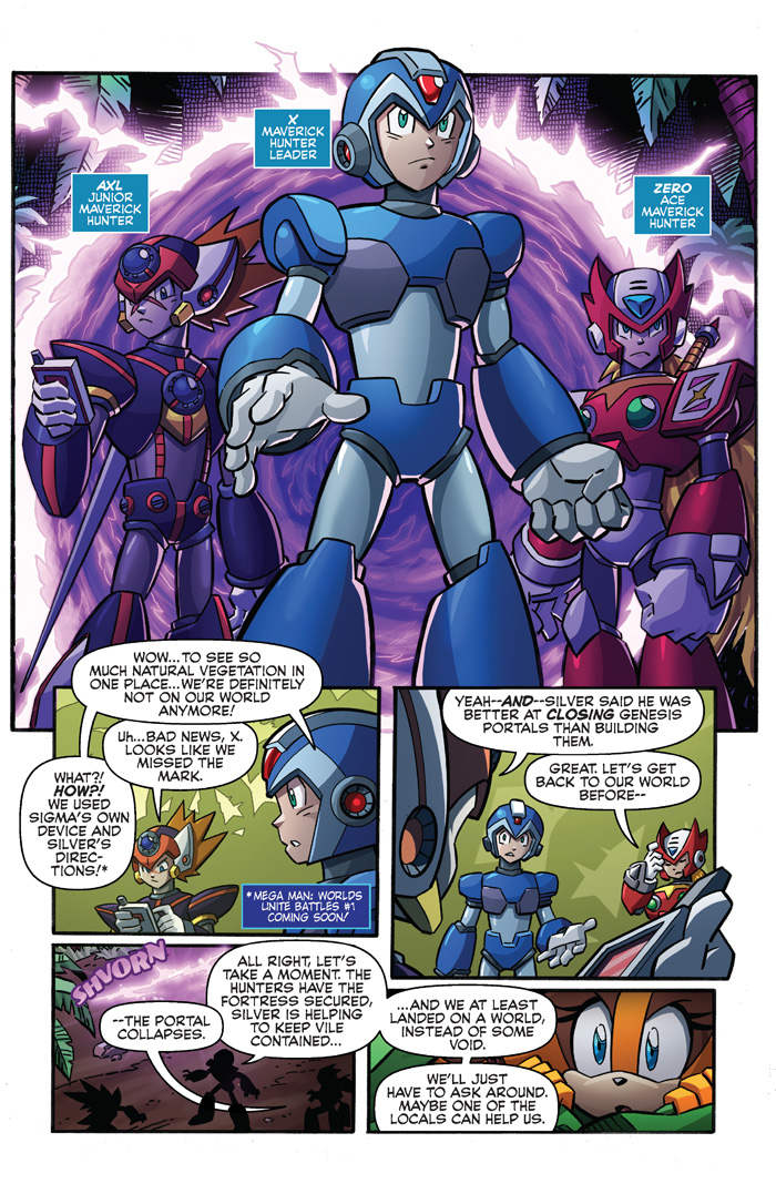 It slices! It dices! It joins line-wide crossover events: it’s SONIC BOOM! “Sonic/Mega Man: Worlds Unite” Part Two: It was just another day at the races—y’know, the ones with the giant spider-mechs? Things start to get weird, even for the lovable, paranoid Sticks, when X and the Maverick Hunters arrived! Meanwhile, the epic bromance of the century is rekindled as the captured Drs. Eggman and Wily are forced to turn their life-long nemeses—Sonic and Mega Man—into minions for the terrifying Sigma! After the history-making “WORLDS COLLIDE” crossover event, Sonic the Hedgehog and Mega Man unite once more—and this time Sonic Boom and Mega Man X are joining the fray! Featuring cover art from the legendary Patrick “SPAZ” Spaziante, a special “happy fun time crossover” variant by Ryan Jampole and part 2 of the epic 12-part connecting variant cover series by artist Ben Bates!