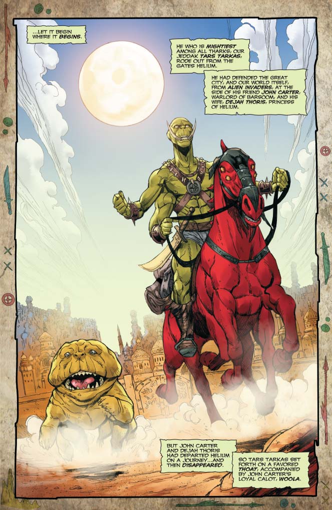It ain’t easy being green! With John Carter and Dejah Thoris lost somewhere in the Martian wastes, Thark chieftain Tars Tarkas takes it upon himself to search for his missing friends. Accompanied by the most fearsome of sidekicks in Woola, the shocking threat Tars uncovers in the desert sands is beyond even his warrior skills. Mighty Martian action in the tradition of creator Edgar Rice Burroughs!