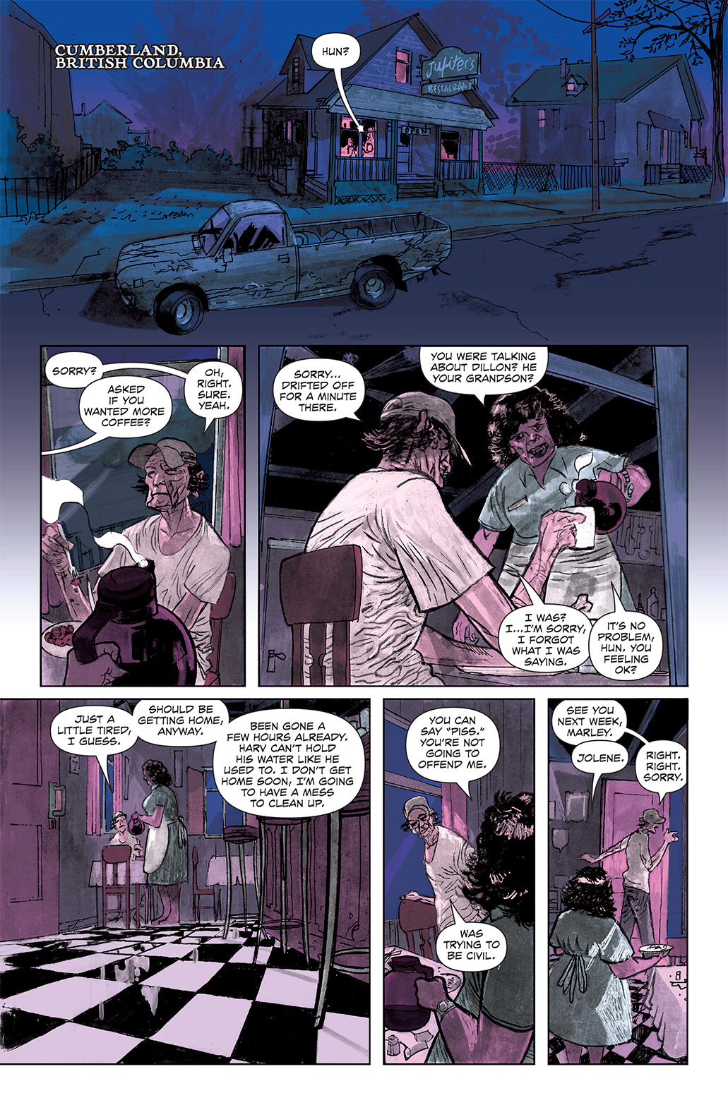 Of course that’s not how it goes… How lame would it be if a comic named “The Last Contract” ended like that? It’d be like three pages long. Oh no, this elderly gentleman might not be able to recall the name of someone he spoke to five minutes before, but he definitely remembers his business. The creative team of Brisson and Estherren seem determined to take us on a violent ride through the Canadian underworld as their murderous octogenarian carves his way up the food chain.
