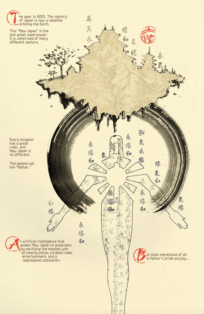 One hundred years from today, Father – the benevolent artificial intelligence that governs the island nation of Japan – will gain sentience. To defend its borders, Father will take drastic action by launching Japan into space…where its people will thrive in isolation, away from the overpopulated and resource-deprived planet below. Over the centuries, as New Japan orbits our increasingly unstable world, it will become a model society – one built on peace, prosperity… and Father’s control.