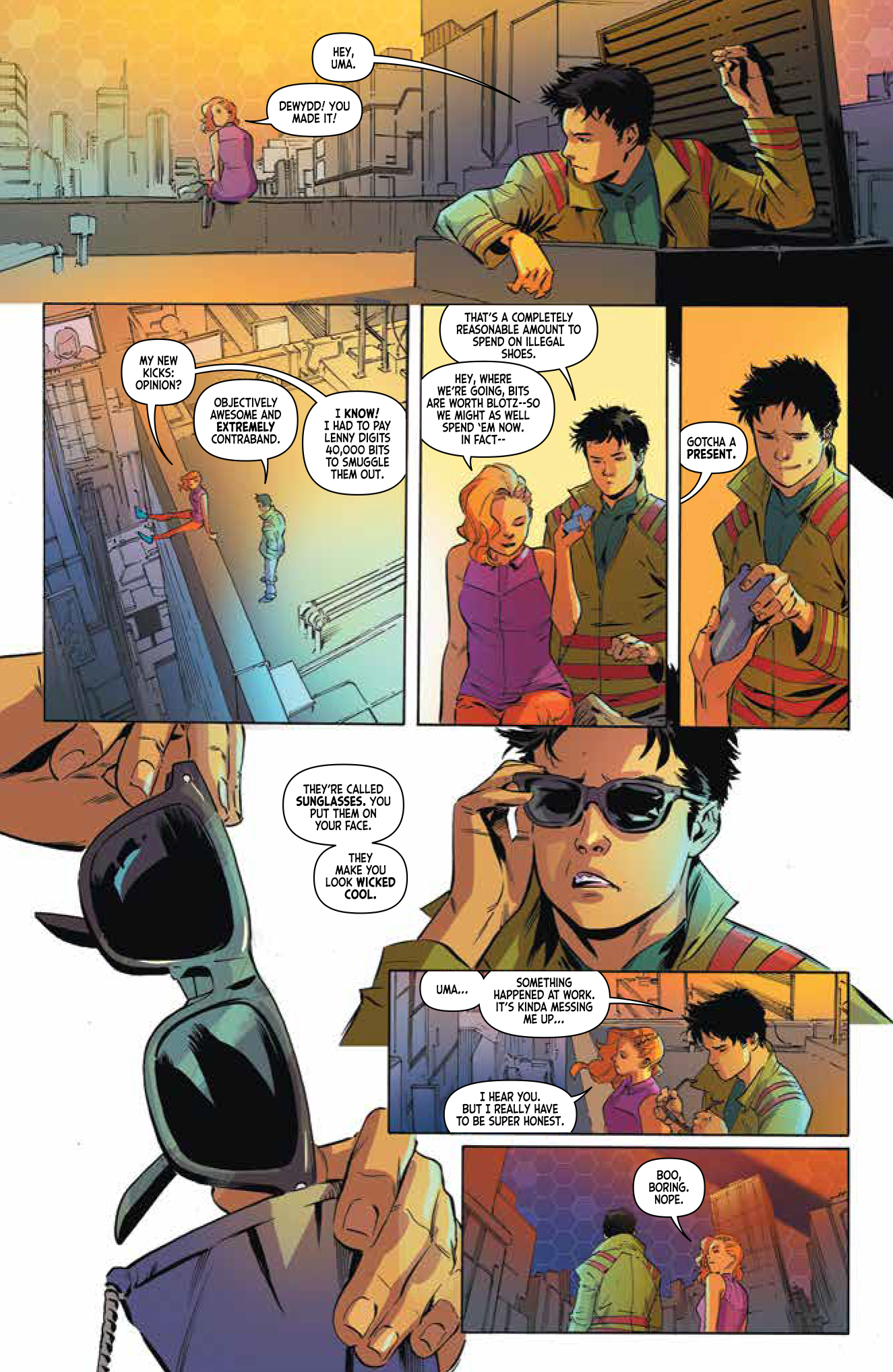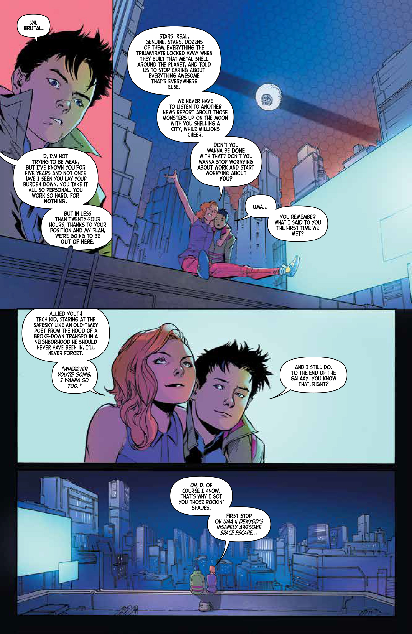 This is the story of Uma Akkolyte, a dreamer, a wanderer (or at least someone who really WANTS to wander), someone who’s biggest fear is the ever present specter of boredom. Having met up with a young fellow named Dewydd (“D” for short…), who also happens to be something of a celebrity in this World Order, Uma has come up with the perfect plan. Her biggest desire is to see the stars that have been blocked out by the SafeSky for as long as anyone can remember, the stars she’s read about in books left behind by her parents. After making radio contact with a mysterious alien from beyond SafeSky, Uma hatches the plan that will get her out into the great Beyond.