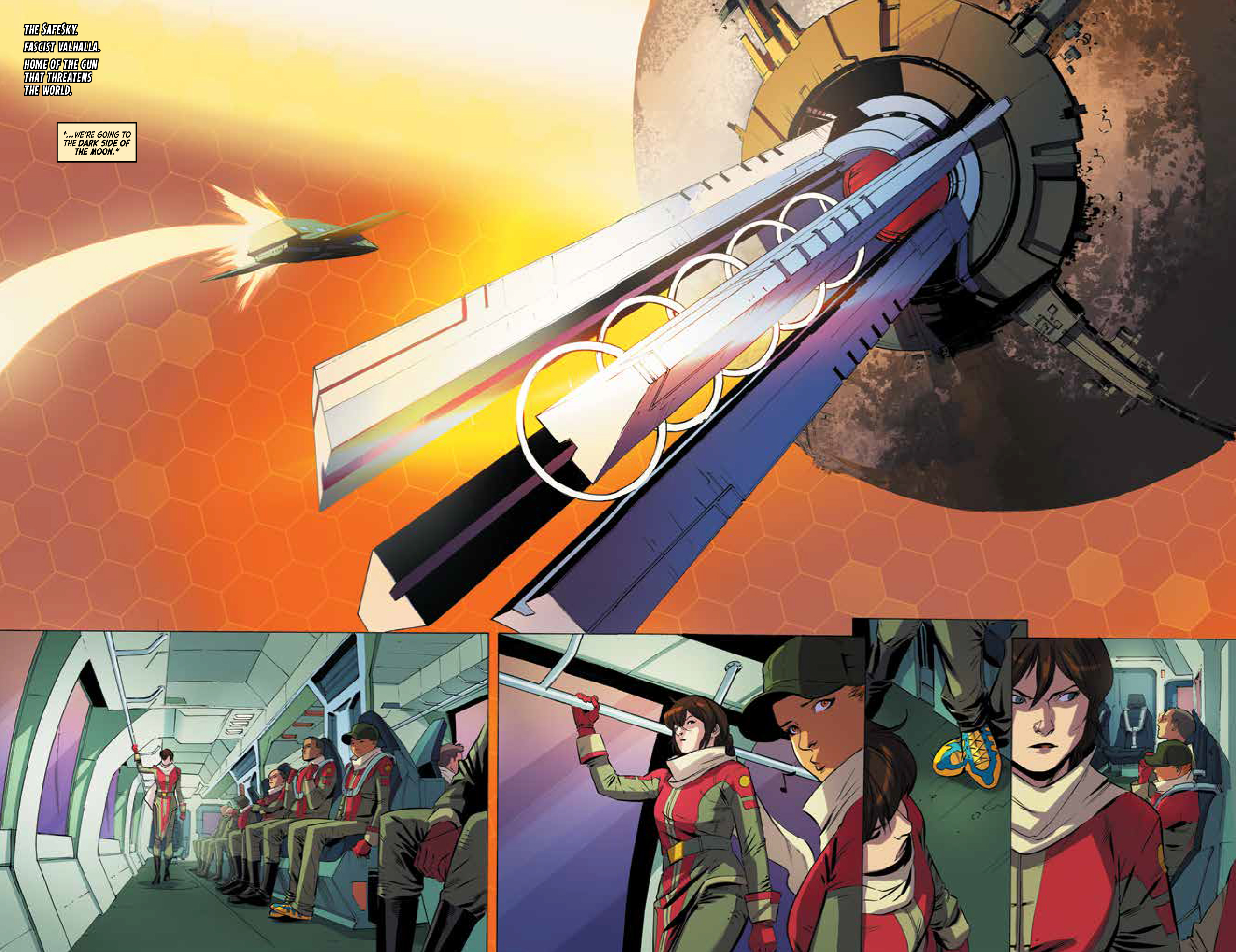 With D’s help, Uma is going to make her way from the planet’s surface to the moon. From there they’ll get outside of the lunar installation and clear of the SafeSky, where all that’s left to do is hop a ride on a starship and take off for whatever might be out there waiting for them. Along for the ride will be the very reluctant Private First Class Catrin, drinker of the metaphorical Kool-Aid, convinced that every evil she’s been told about will befall them once they step outside of the loving embrace of SafeSky. All Uma and her dysfunctional band have to do is make it past unbeatable security, from under the ever watchful eye of the one world order, to the dark side of the moon, and onto an alien spaceship.