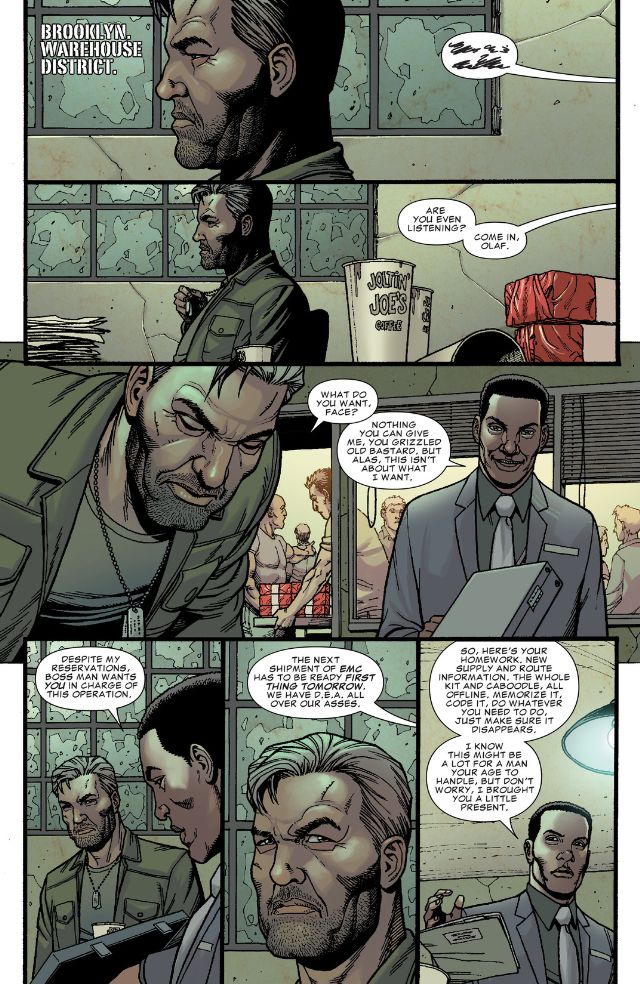 So what’s this story going to be about? In this first issue of the latest run, the impression I got was that at its core it isn’t going to be about Frank Castle. As was stated a couple times in the issue, Frank Castle is dead. All that’s left is the Punisher, and he isn’t a person… he’s the Spirit of Vengeance (sorry, Ghost Rider, the pattern is set), fury and carnage personified. There’s no threatening, no bargaining, no pleading to be done. When the Punisher comes for you with bad intentions, you can only fight and die, or run and die tired.