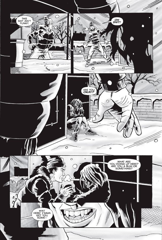 The writing by Mario Candelaria apparently does a good job of conveying an idea without beating it over the head. The reader is given the relevant information they need, but not so much as to lay the entire story experience out by the numbers. We’re still given the opportunity to read into the subtext, to inject our own ideas into the narrative, making it more of a personal experience. Similarly the black and white artwork by Scott Ewen is starkly suited to the story’s narrative, giving us nothing but sharp contrasts with which to take in this version of Detroit. Ewen’s character design is well done, a fact highlighted in the scene where Torrie the Spirit shouts her frustration to Torrie the Vampire. We’re shown the two faces superimposed over each other in split panels. While the two are superficially identical, the differences are pretty obvious, particularly when the vampire’s evil grin is compared to Torrie’s haunted expression.