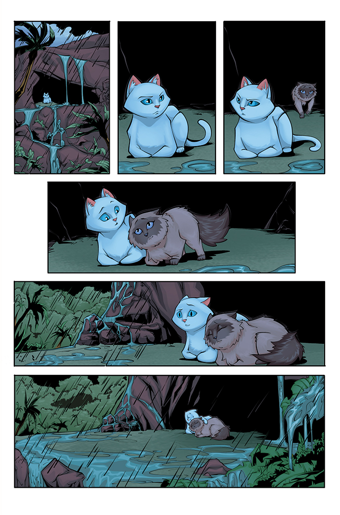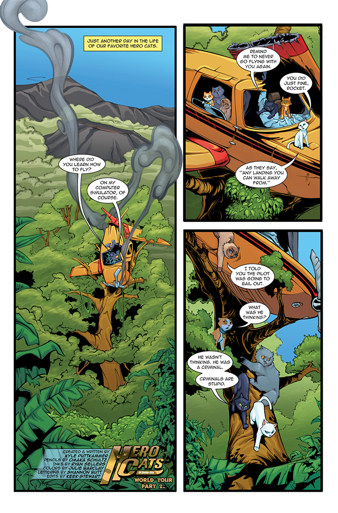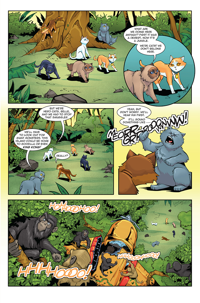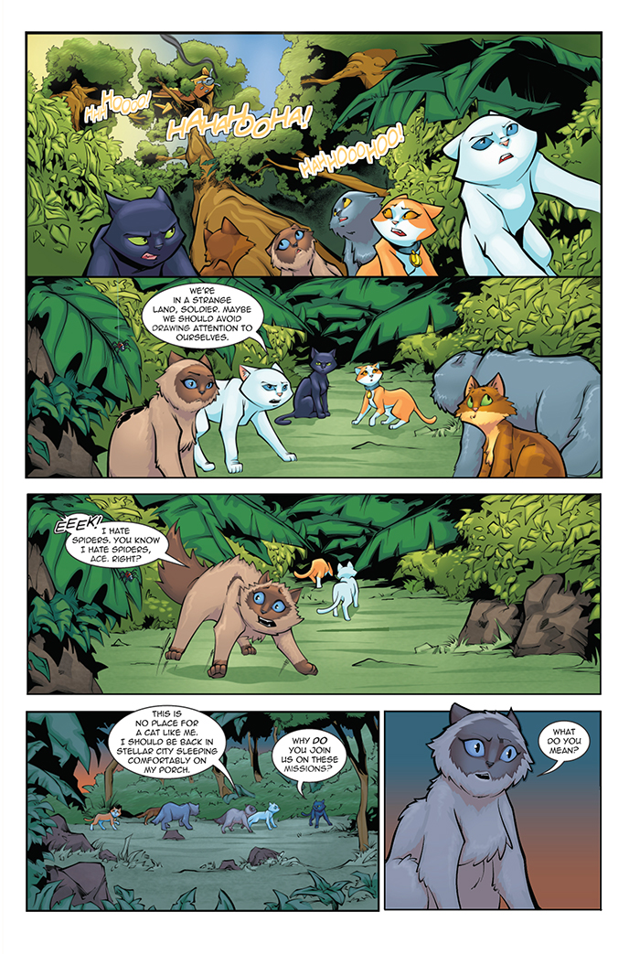 The issue opens with a crashed airplane. Ace and his team of Hero Cats have benefitted from the adage “any landing you can walk away from…”, as well as Rocket’s love of flight simulator video games. Don’t ask me now a cat managed to fly a plane at all, much less brought it to the ground in anything resembling one piece, because we’re not just talking about any old ordinary group of house cats here. As they take stock of their surroundings, the cats find themselves in an unknown jungle on an unknown island, completely out of their element. As Belle, newest addition to the group and a bit of a primadonna, puts it, “I should be back in Stellar City sleeping comfortably on my porch.”