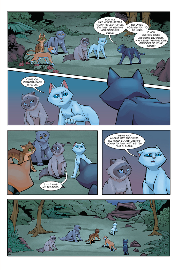 There are some jumps in the dialogue that were a little confusing, where it almost felt like there was a page missing or I’d skipped a panel, but overall it moved along pretty well. I had to remind myself several times that this wasn’t really written for my age group, which helped. The artwork is pretty cool, handling the feline protagonists well and keeping them firmly on four legs instead of humanizing them by putting them upright and giving them thumbs.