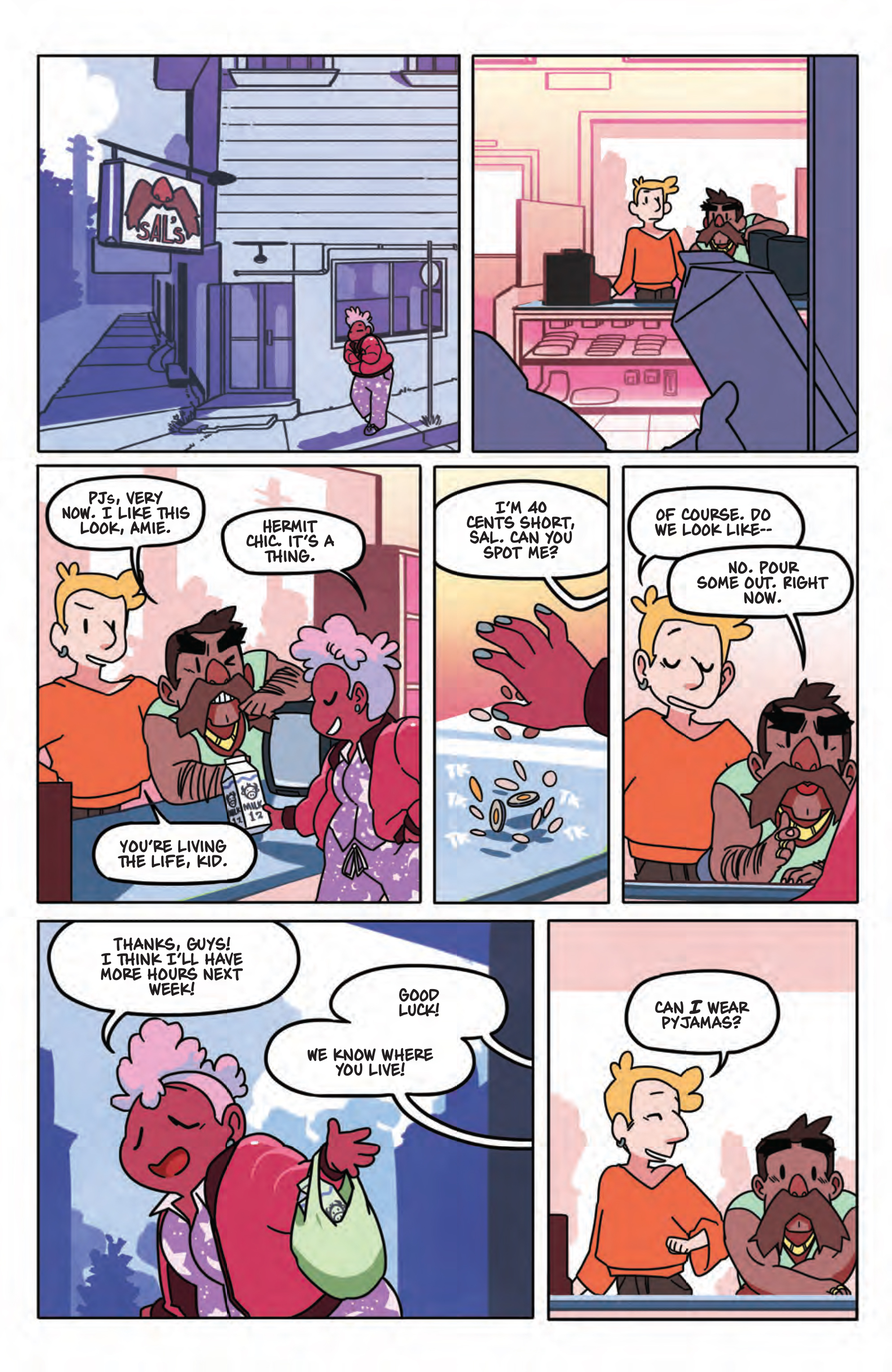 Kate Leth tells a great tale: What if the grandest power in the universe went not to those who had been preparing for years to accept it, but to four who were unaware such power (or aliens) even existed? We are brought right in to Amie’s life, the girl on her own working at the pet store. She’s named all the animals at the store, but hasn’t quite gotten the hang of people or schedules or money. She has brief interactions with a construction worker and a customer, and then BLAM! a light hits and she’s suddenly got powers! With some amazing storytelling, Leth creates a world that we can all imagine being a part of, despite aliens arriving at your workplace. Her characters are very real people, and the only overly-dramatic one is Amie’s boss. Even the aliens (the good guys, anyway) are reasonable and tolerant. Also, this book could take place anywhere in the world, because it doesn’t pinpoint any specific culture or country. The humans featured covers the spectrum, without commenting on it, which is a beautiful thing.