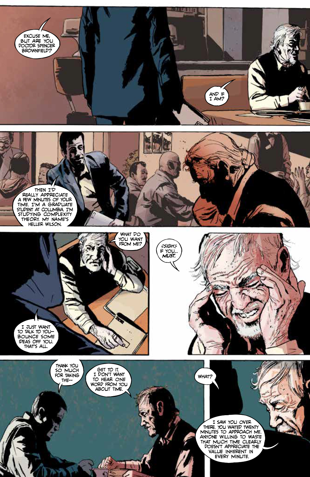 Now what we have here is some high concept storytelling from the folks at Boom! Studios. They’ve given writer Charles Soule the duty of putting together a tale of high tension, of suspense, a story that poses the question, “if you could predict catastrophe, what would you do about it?” In the character of Heller Wilson, by every indication a pretty good guy, Soule has introduced an Everyman who believes he’s simply on the path to a degree and hopefully a career. What Heller is, as of yet, totally unaware of is that he’s walking a tightrope. Back when Dr. Brownfield first proposed his thoughts on the subject, he was more or less tarred and feathered by his peers, and his work was left unfinished. Now, the good doctor sees an opportunity to not only continue his work, but also pass it on to a worthy successor. And once that torch has been passed, who else out there might be paying attention to the same equations and probabilities that Heller has just begun to toy with?