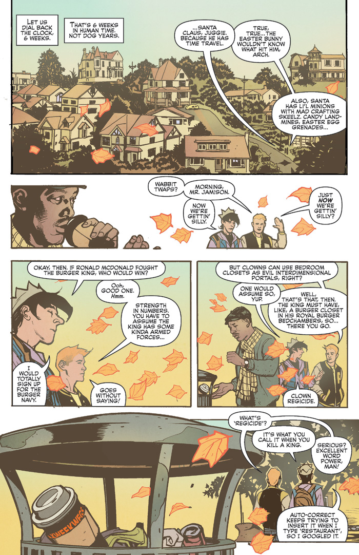 Hughes’ art…..well, you can’t say enough good things about Adam Hughes’ ability to draw living, moving, breathing characters who have a myriad of expressions and convey so much with just a look. His pin-ups are amazing, but to see his characters occupying space and doing things is a special treat. There’s just no one like him. If this is your first introduction to his work, you’ll need to find everything ELSE he’s done and BUY IT, BUY IT NOW!!! …….Oh….erm…I mean he’s very good. Brilliant colors from Jose Villarrubia, highlighting moods and drama with just a little palette change, but keeping with the over-all sunny demeanor of this all-ages book.