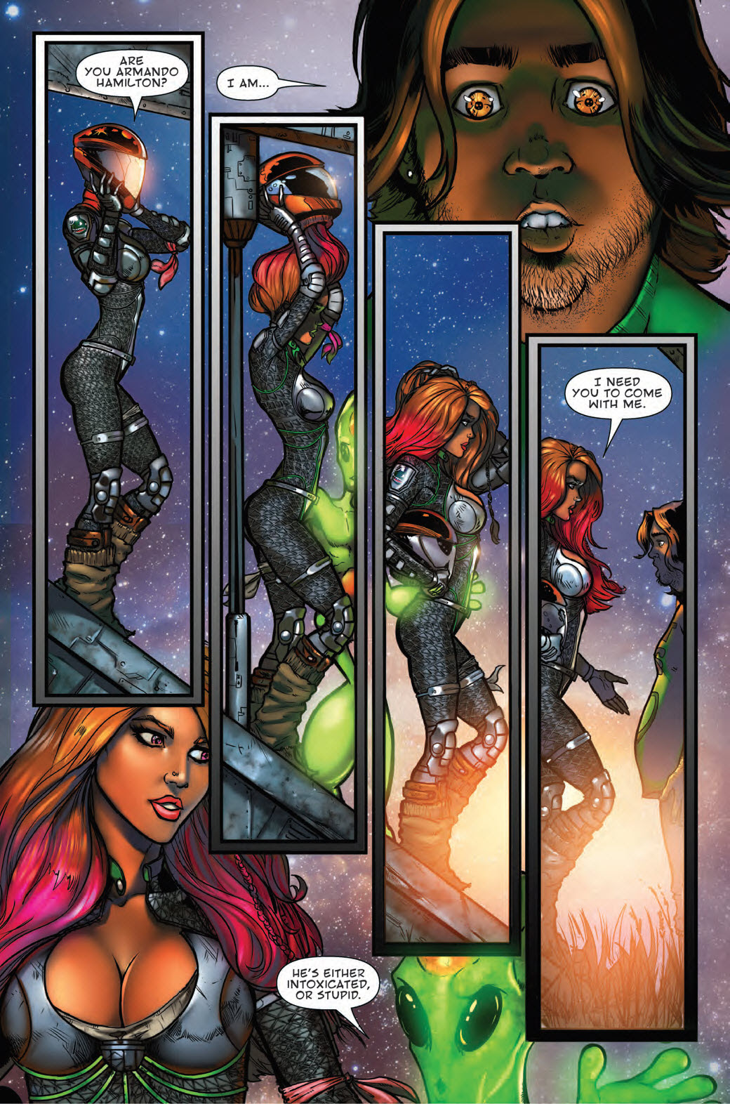 This story, which is a six issue miniseries begins with her taking on a job to pick up and deliver a seemingly normal human (if a heavy set drunken frat boy can be considered normal) to her broker. When she returns with her prize, she finds her broker murdered and must now play a cosmic game of cat and mouse with her paycheck named Armando in tow as she seeks to discover who originally brokered the deal so that she can get paid.