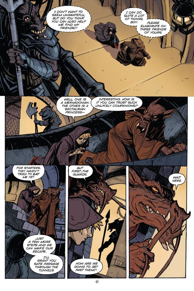 In volume two, Erik’s situation hasn’t really improved. He’s the prisoner of the subterranean Groundlings, gifted mapmakers who are convinced that Erik led the minions of Dr. Once to their hidden underground city. With the help of a mysterious ally, Erik escapes before he’s executed for his perceived crimes. Now in a borrowed/stolen underwater ship, Erik is once again on the run, heading toward the Mermidonian stronghold, where he’ll be reunited with his new friends Mermidonian warrior Morgan and Sectaurian princess Thea. Still being pushed and pulled, directed by outside forces with no say in his own fate, Erik struggles to take control of his life. To do that, he’s decided that he can’t be afraid anymore, to act instead of being acted upon, and to defend his new friends come hell or high water. Erik’s final stop in this episode of his ongoing story is the hive city of Sectuarius, Thea’s home. There, he finds the next step in his journey… for better or for worse, because if everything was roses and bunny rabbits this would be a very boring story.