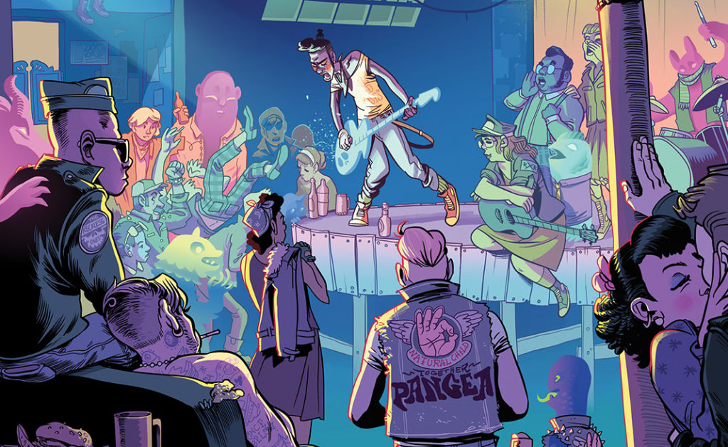 “This is one of those sky-high concepts that hits like a bolt from the blue and won’t let go: an alternate reality where worship has replaced technology and money,” explained Spurrier. “Drench it in an exhausted late-’50s aesthetic—all greaser quiffs and hotrod bullies—fill it with monsters and mobsters, get it drawn by literally the most exciting young newcomer in comics today…and away you go. Like all good genre fiction, Godshaper has the means to say a loooooot about our own world, and—sure—it’s packed to the brim with tasty thematic platefuls of religion, greed, prejudice, consumerism, vanity, crime, war… It’s all there. But at its big, throbbing heart this is a story about two super-likable outcasts on a surreal, scary, sexy, and utterly singular journey through a world which hates them.“