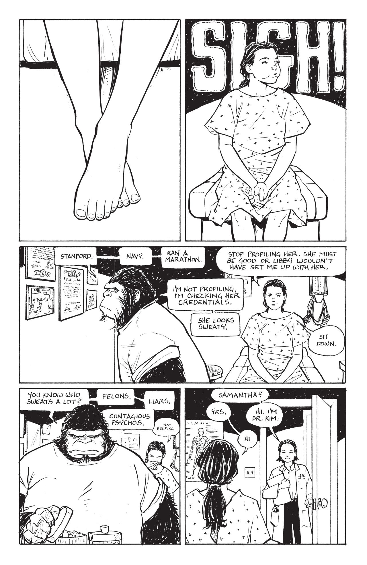 It’s an intense and perfectly scripted scene that shows Sam, and Mike, to be two solid and thoroughly thought out characters. These are just two people (okay, one person and an ape) that anyone worth their salt would be happy to know, if not for the unfortunate fact that they are characters in a comic book. Terry Moore goes to great lengths to illustrate and reinforce the very simple fact that, although she did endure atrocities, Sam doesn’t consider herself a victim of them. She doesn’t look for pity or understanding; no well-intended but essentially empty words of sympathy or condolence. She was, and is, first and foremost a Marine. Everything else is stuff that may have happened to her, but in no way did it break her.