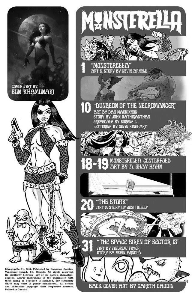 But her adventures are just one chapter of the book. In the style of the classic Vampirella magazines, Monsterella goes on to introduce other astonishing tales told and illustrated by a creepy collection of Canadian talents that will be sure to chill and thrill you cover to cover! Featuring Andrew Fryer, A. Shay Hahn (“The Homeless G-Men”), Dan MacKinnon (“From The Ashes”), Gareth Gaudin (“Enid Jupiter and Lyra Gotham”), Josh Kully, John Rathiganthan (“From The Ashes”), Nevin Arnold (“Calavera The Undead”) and sizzling cover artist Sun Khamunaki (“Lady Death”)!
