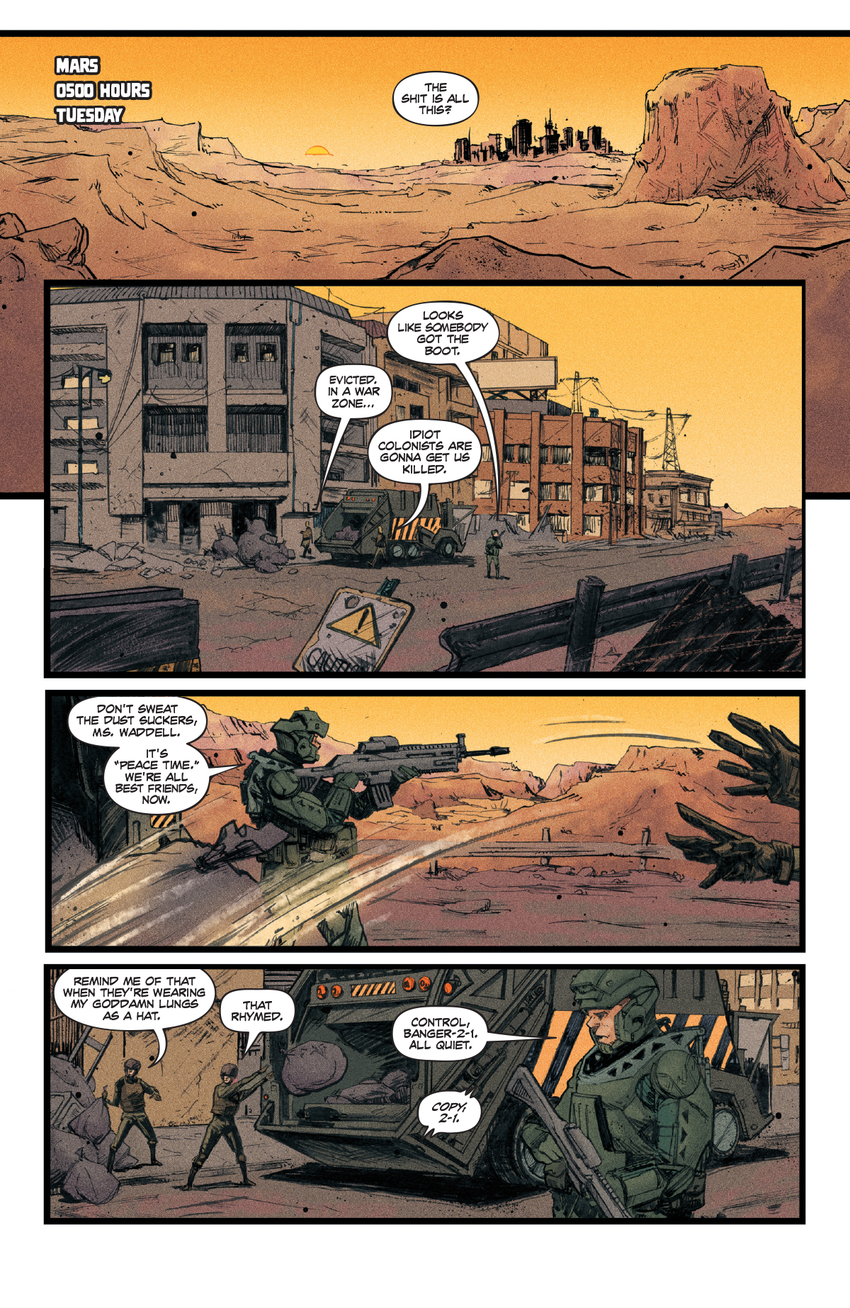 Over the years, there’s been a multitude of stories featuring the possibilities to be found in outer space, and eventually we might get there some day. With all of those stories out there, the biggest hurdle for a new comic series is going to be standing apart from the herd. Many don’t. The ones that do are those that find one thing, whether it be in the art, the use of “realistic” technology, or the overall tone of the story. Whatever it is, there has to be something to stand out. Redline doesn’t bog itself down in too much technical detail, and it isn’t particularly worried about creating a story around an established detailed backstory. We’ve colonized Mars, it has a breathable atmosphere, and we’re having trouble with the locals. Done, now let’s move on.