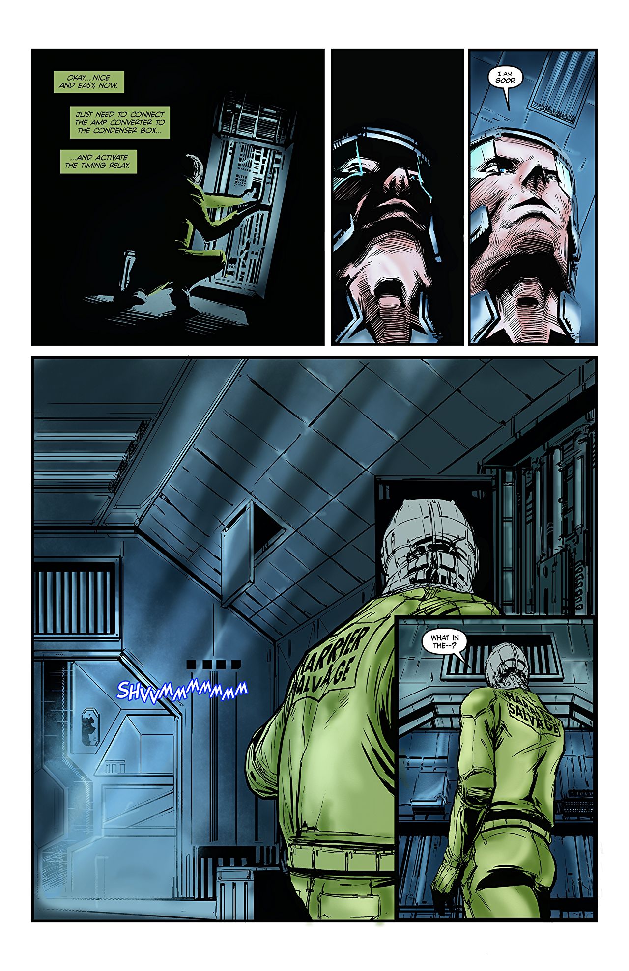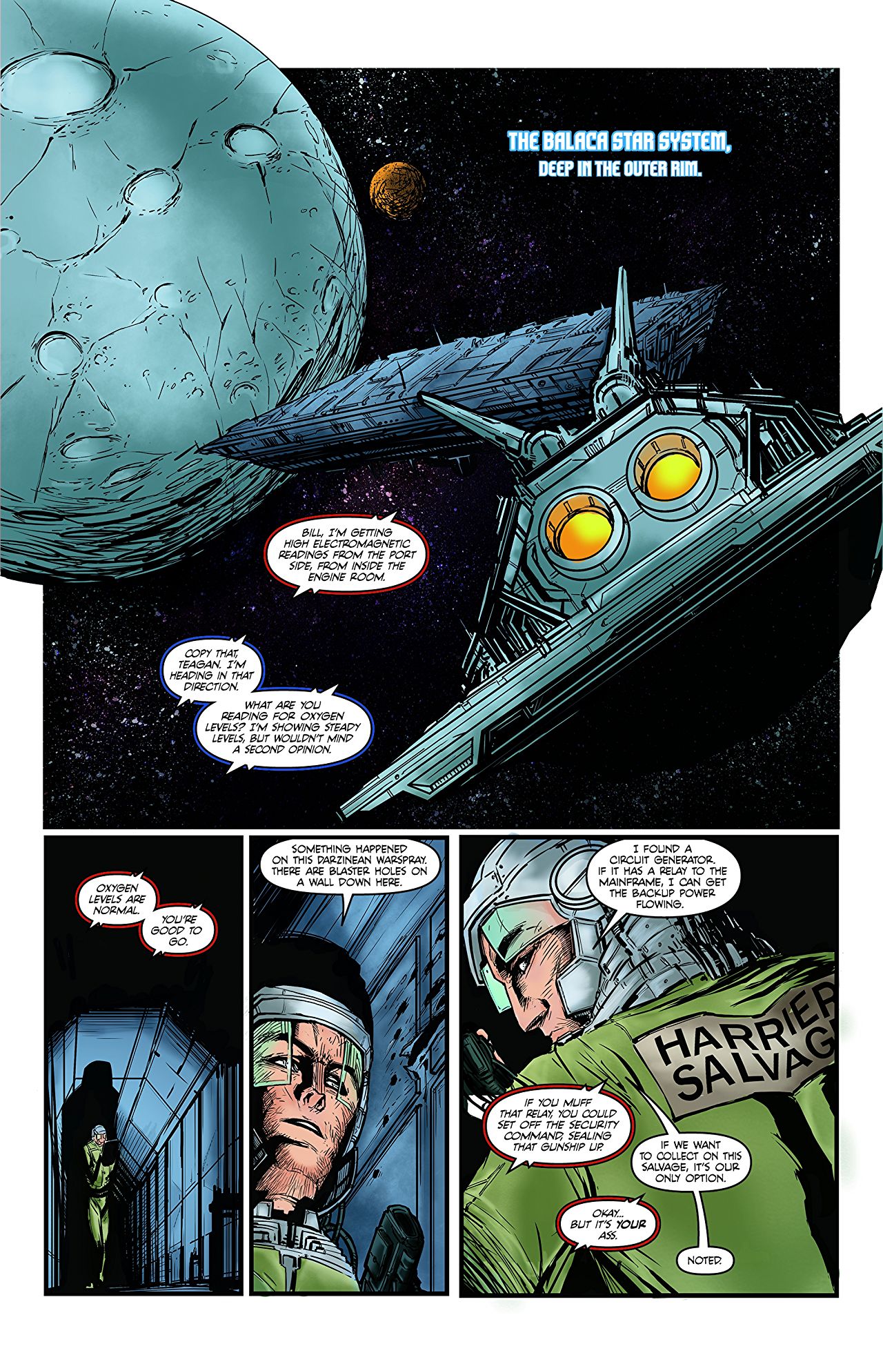 Writer Bob Salley has put together a gritty post-war universe in which a continued existence is neither easy nor guaranteed. He’s peopled this universe with a variety of alien races, multiple factions of power players, and the opportunistic criminal element guaranteed to be looking for any profit they can take by guile or force. Zooming in on his crew of Salvagers aboard the Harrier IV, Salley has given us a cast of easily identified archetypes. Led by former military turned privateer Captain Bill Roenik, the cast has its brooding but always stalwart center. He’s competent and cool-headed in a pinch, and is always thinking of the safety of his crew, both on and off the job. At the Harrier’s helm is Teagan, interfacing with the ship’s AI to keep tabs of her crew from the confines of her pilot’s seat, conducting system checks and sending out overrides to look after and assist her people from a distance. The cigar smoking trouble magnet that is Brigby fills the role of the technical genius who’s as handy with a wisecrack as he is with an alien computer system. Finally, Ty’r is on hand to… well, Ty’r pretty much breaks stuff, using the most violent means at hand. Also, he occasionally fills in as the Harrier’s backup mechanic.