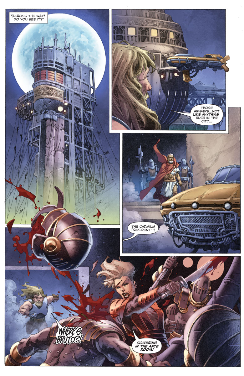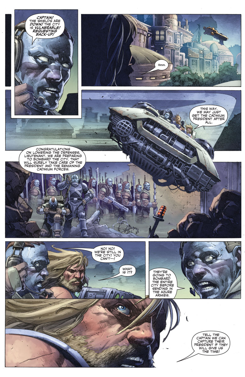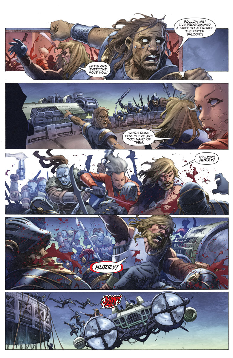 Taking up the visual side of the artistic challenge, the team of Tomas Giorello, David Mack, Zu Orzu, & Diego Rodriquez has a lot on their collective plate. The action is intense, flowing from one panel into the next as Aric and company fight for their lives. As far as epic sci fi goes, they’ve nailed it in these books. The clearly defined characters leave us with little doubt as to who’s doing what at any given time, and there really is a sense of motion as the story moves from one action scene to the next. The most impressive aspect, as far as I’m concerned, comes in between those action beats, and later on in the issue after the battle is over. The close ups we’re given of Aric show a guy who really doesn’t want to be there, who would love nothing better than to be left alone, at peace, to come to terms with what he’s lost. He has no interest in the fight, but he can’t allow those around him to be slaughtered if he can do anything to prevent it. It’s right there in the eyes, man.