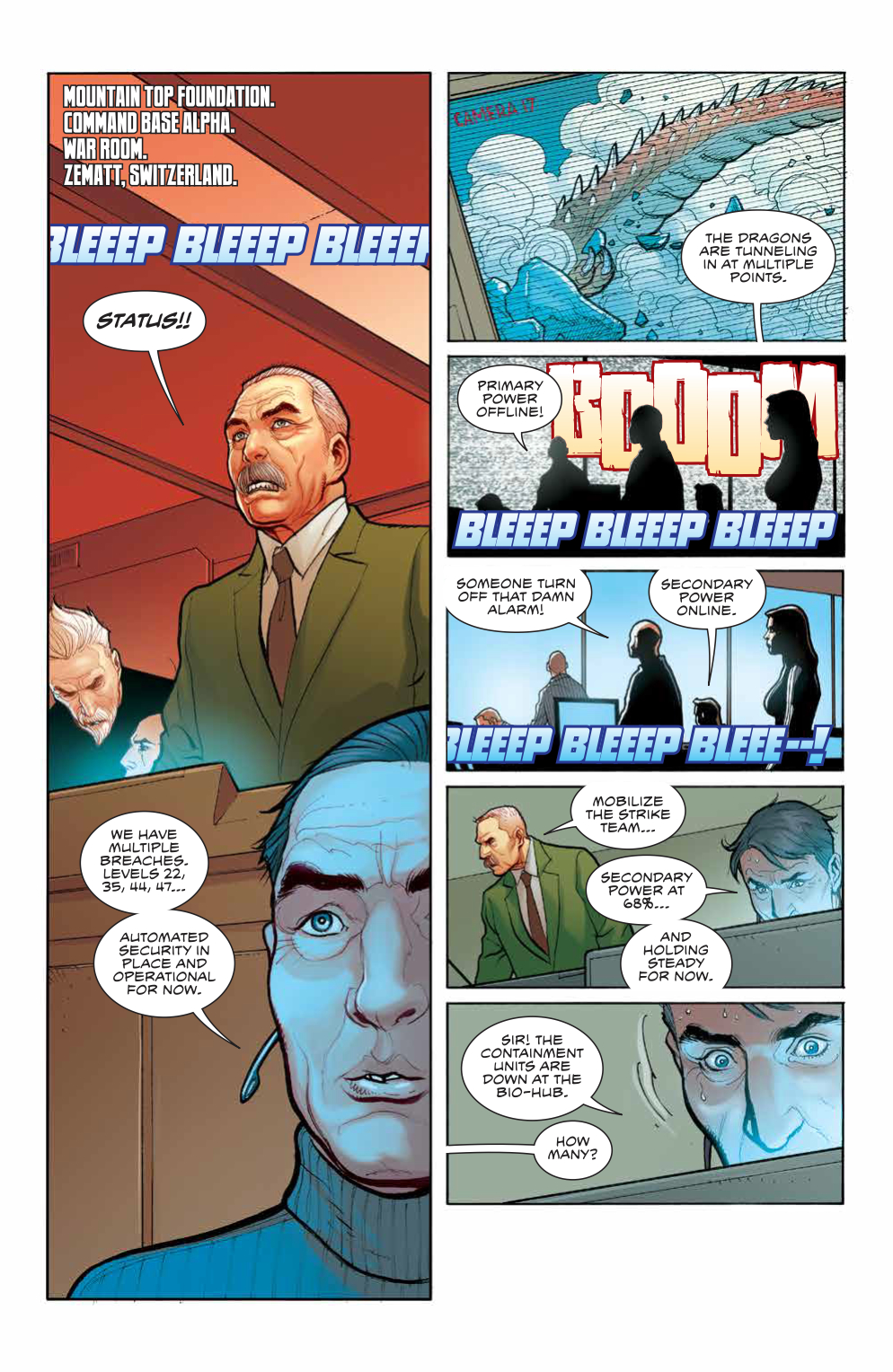 Skybourne is, at first glance, a simple action-oriented title that serves the purpose of putting out some flashy fight scenes featuring impressively drawn heroes, villains, and monsters (fun fact: Frank Cho loves drawing dinosaurs). The indestructible and mostly immortal Skybourne siblings have found themselves put through some pretty rigorous paces over the course of the first four issues in this five issue run. Okay, sure… Grace got taken out in the first issue, but she laid some pretty intense beat down before Merlin ran her through with Excalibur. And maybe Thomas has had a tough time getting back into the swing of things, his controlled sparring sessions with the Vault’s menagerie of captured mythological beasts having gone less than spectacularly. All that has just been leading up to The Big Show… that being Merlin’s arrival at Mountaintop’s base of operations. The gloves have been taken off, wadded up into a tight little ball, and thrown unceremoniously into the dirt, and Thomas has no choice but to step up.