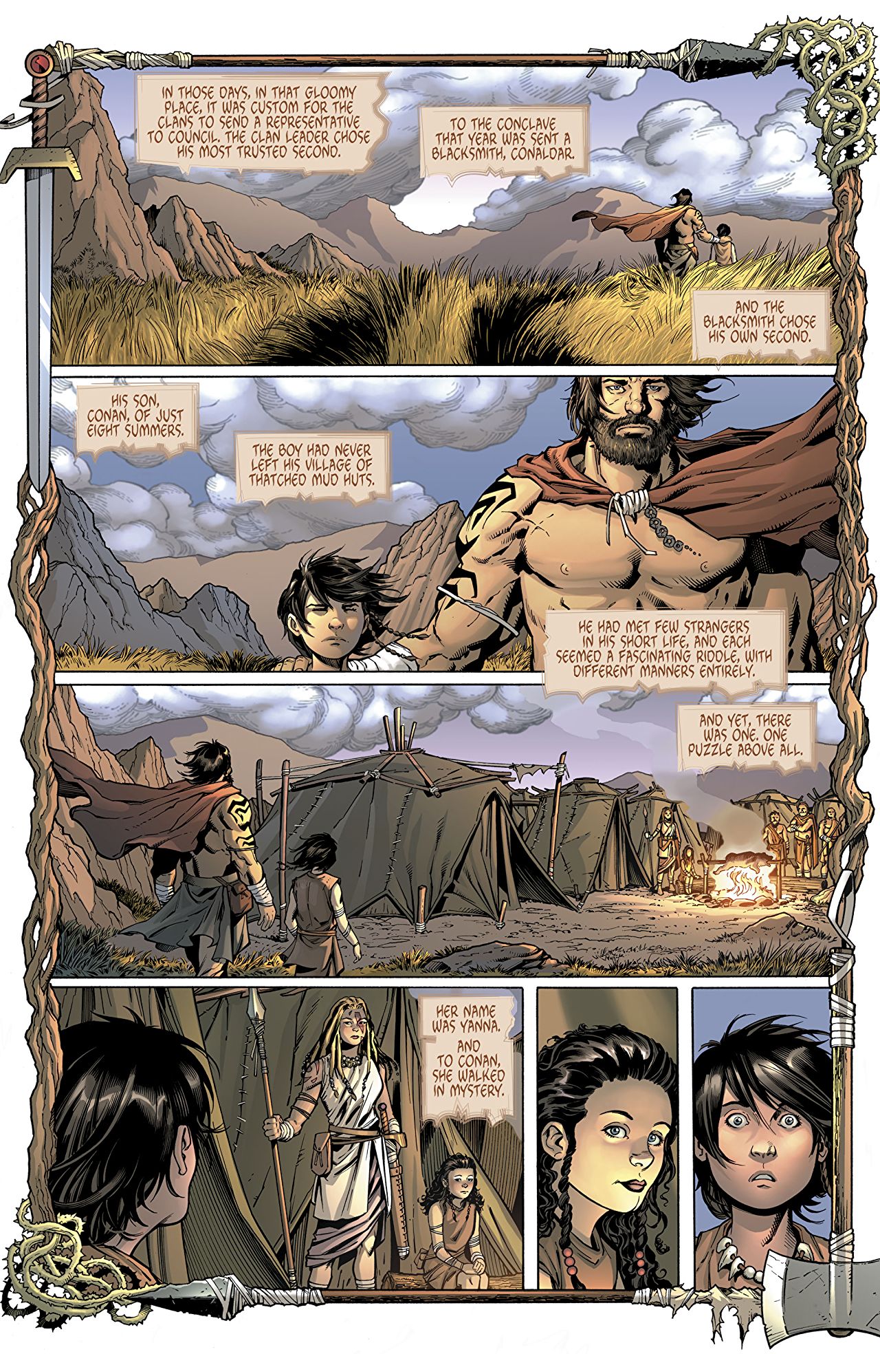 Before you start, with all the indignant cries of “she’d never have anything to do with that ape!”, we need to make something clear. This isn’t a story about time travel, with Diana being transported back to the Hyborean Age. This is more of an Elseworlds tale of an age undreamed of, where Conan is haunted by a memory of his youth, when he accompanied his father to a summit meeting of clan and tribal elders. At the meeting, a contingent of female warriors from an unknown island attended. With them was a young princess, the daughter of the tribe’s leader. Her name was Yanna, and “to Conan, she walked in mystery.”