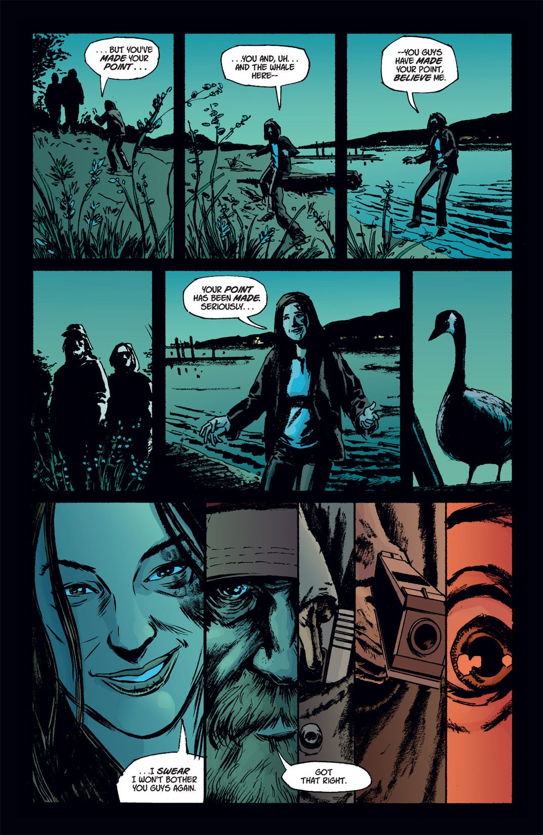 Sorry, I don’t have a better transition from writing into illustration, so I’m just gonna have to say, boy that Matthew Southworth sure can draw! I’ve mentioned Stumptown’s settings, and the heavy reliance on real world locales and backdrops that the story takes place in. None of that would work if Southworth, with backup from Lee Loughridge & Rico Renzi on colors, wasn’t able to give his backgrounds the attention to detail they need without overshadowing the action going on in the panel. For example, the aforementioned steak joint… I had to zoom in on the sign (page 40) to be able to make out the name of the place, and only then did it occur to me to look the place up. When I did, I was happy to discover that the place not only exists, but also that both external and internal shots were obviously used for reference in the scene. But it’s all done so that the setting doesn’t drown out the characters. As solid as Southworth’s work is, I’m going to say that the backgrounds benefitted most from the coloring of Loughridge & Renzi.