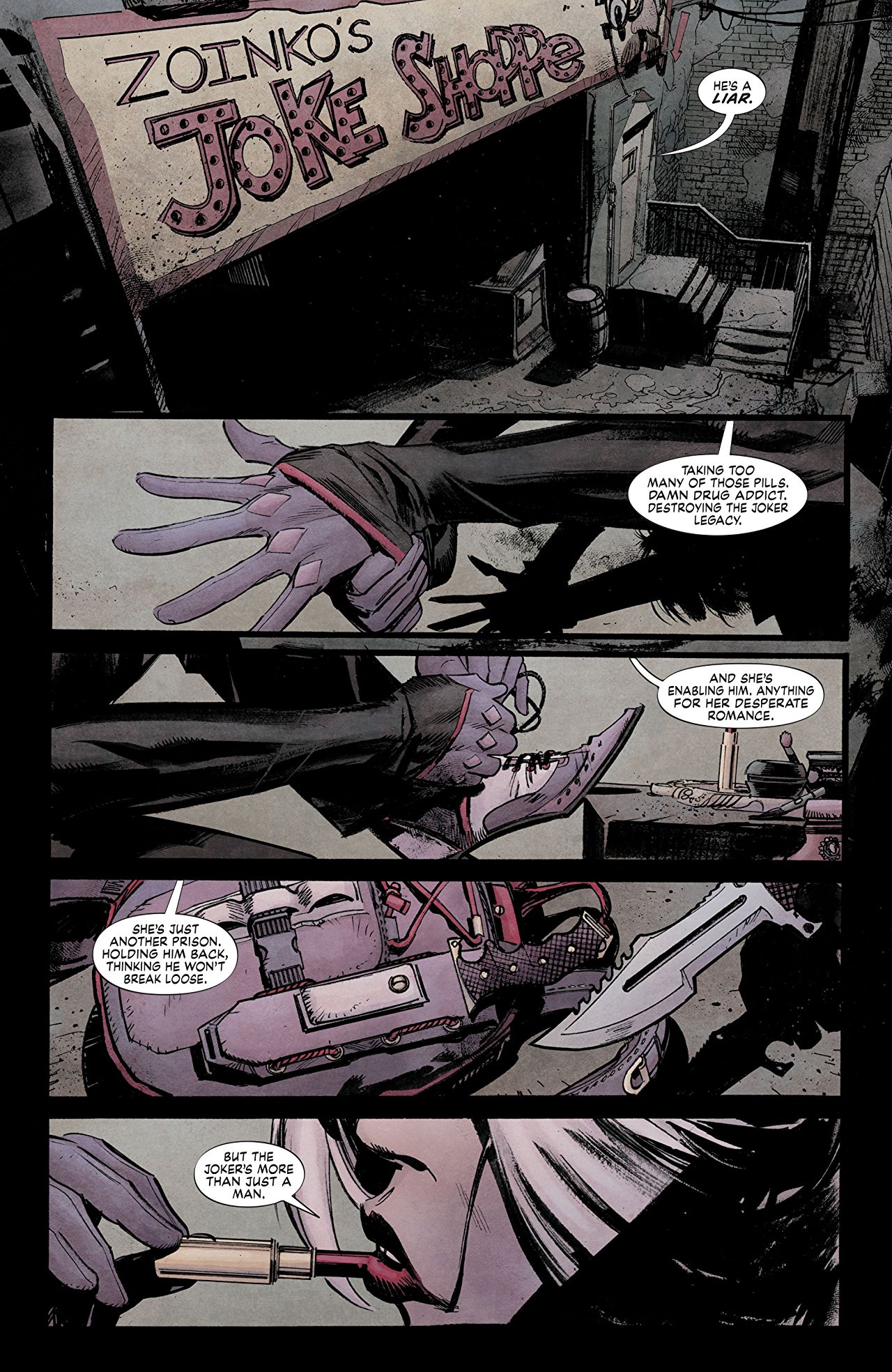 In what I think is a brilliant little bit of retcon, Napier is also reunited with Dr. Harleen Quinzel… the original Harley Quin… who wastes no time in kicking the current imposter to the curb. Fans who remember Harley’s earliest days in Batman: the Animated Series are going to appreciate the story behind this twist, while the crowd more familiar with Harley as featured in the Suicide Squad movie might be a little disappointed. This isn’t the only tip of the hat made to Batman:TAS. I’ve found numerous references to that classic cartoon in the pages of White Knight (my personal favorite so far was a nod to “Almost Got Him”- one of the series’ more popular episodes- back in issue 2).