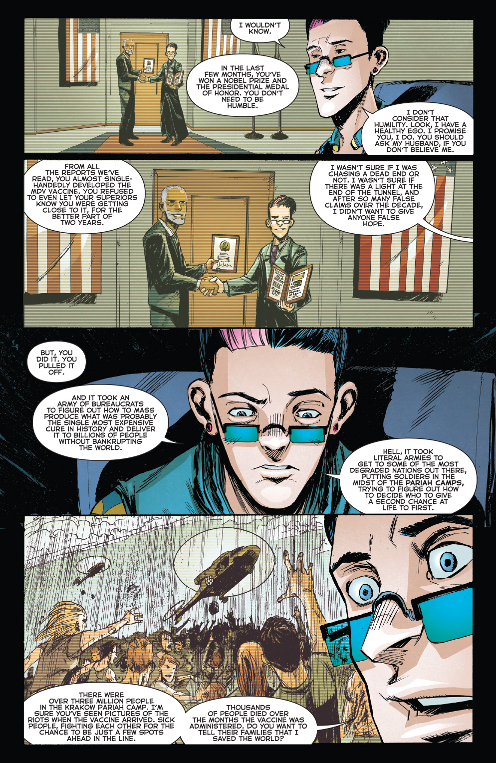 In the year 2023 the Mississippi Delta Virus (MDV) swept across the globe, killing over seven-hundred million people. The world’s greatest and brightest spend years searching for a cure, and over the course of a decade it was estimated that sixty percent of the world’s populace was either an infected carrier or a dying victim of the disease. Everything changed when, in 2035, thirty-three year old geneticist Dr. Cyrus Crane (from Madison, Wisconsin… go, Cheeseheads!) developed the miracle humanity needed. Mass produced and globally distributed by pharmaceutical company Gonring-Cole, the vaccine had a one-hundred percent success rate. No more victims of MDV, and the world breathed a sigh of relief.