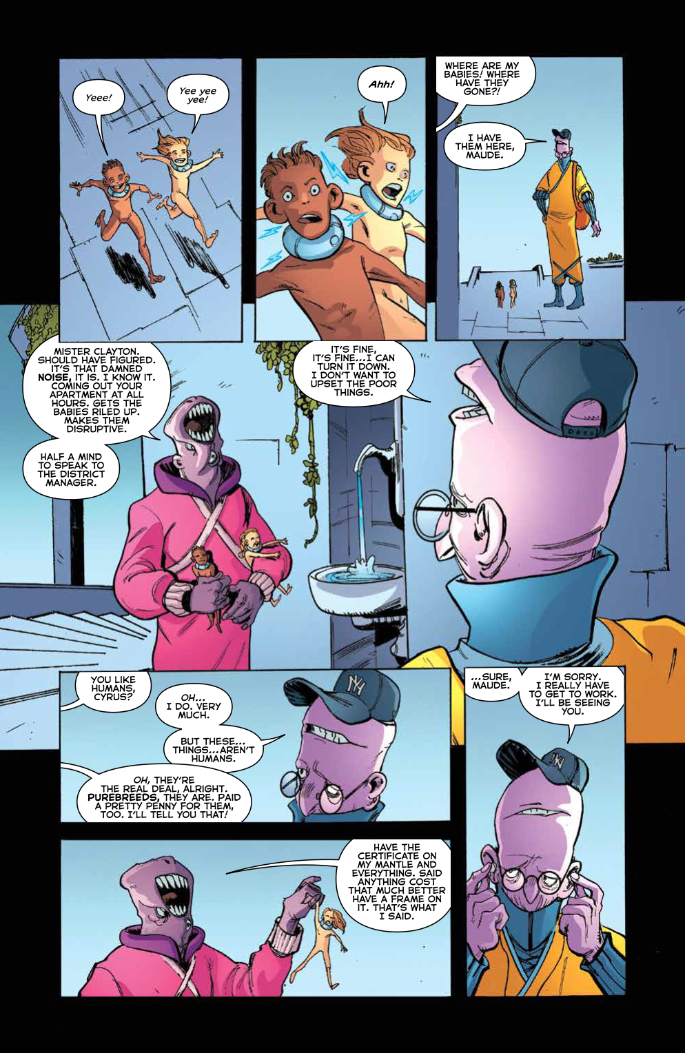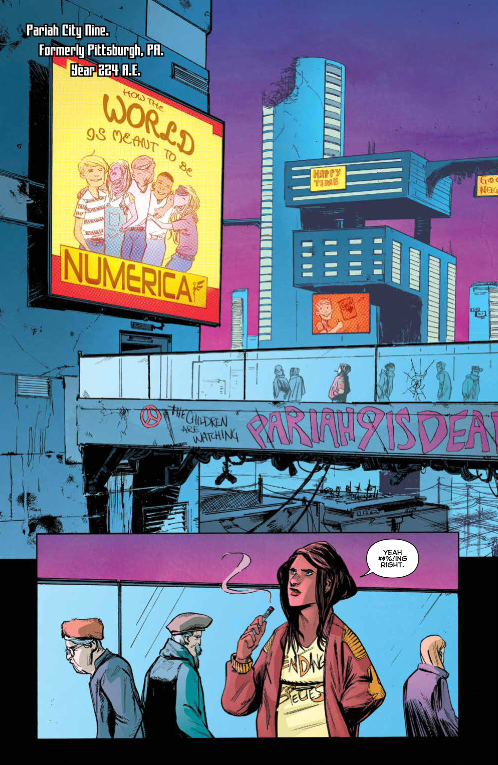 Now it has to be acknowledged that the fine words put to paper by the most prolific of writers can only be aided in their task by an artist who can capture their intent without flinching away from the grotesque. Take the plunge and read through Eugenic’s three issue run, and you’ll see that Eryk Donovan could very well be that guy. His images, often disturbing, embrace the ugly truths laid out, giving Tynion’s scripts form and visual context. In the first issue, we see society more or less as it is today, full of conflict and opposing viewpoints shouting at each other from either side of a conflict (pick one). The second issue, set two hundred years later, introduces the possibilities attained in a world without moral compromise. The third and final issue, yet another two hundred years down the road, finds a world that’s forgotten its mistakes and has once again convinced itself that everything is awesome.