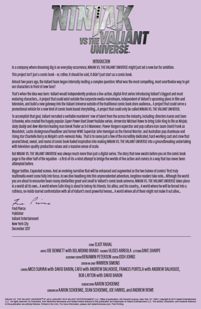 Watch the upcoming live-action digital promotion coming soon – then jump headlong into the fight-fueled showdown of the century as acclaimed writer Eliot Rahal (The Paybacks) and red-hot artist Joe Bennett (Teen Titans, Deathstroke) reveal the full scope and adrenaline-drenched intensity of…NINJAK VS. THE VALIANT UNIVERSE!