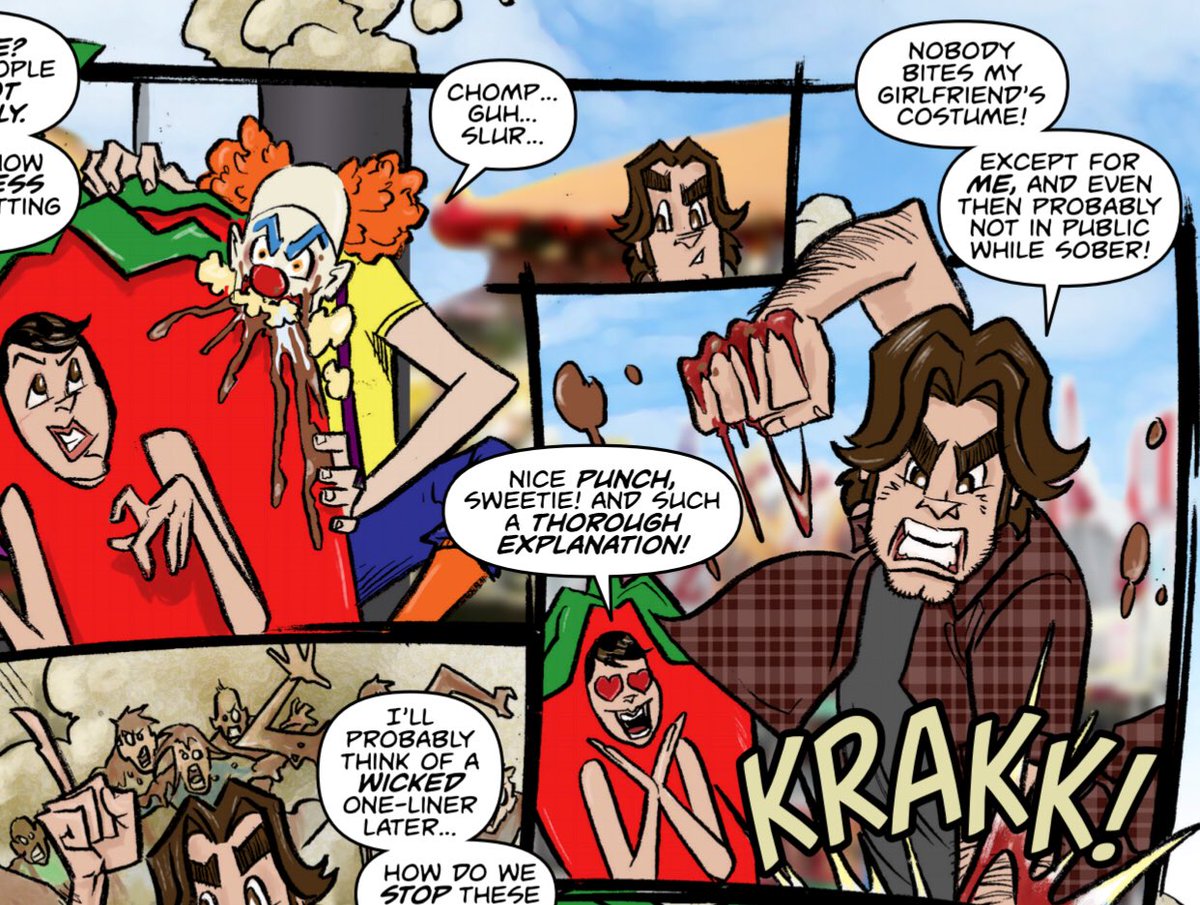When the carnival comes to Holliston, our lovable losers/heroes must save the day after Laura’s famous “Murder Pepper Chili” turns the citizens of Holliston into raging zombies. Adam, Joe, Laura, Corris, Lance Rockett, W. Axl Rose the Cat, and almost every supporting character you love from the TV series return in this brand-new, 52-page graphic novel overflowing with laughs, action, and carnage! Loaded with laughs, guest appearances, and horror movie references that fans of the show or just fans of great comics will all enjoy!