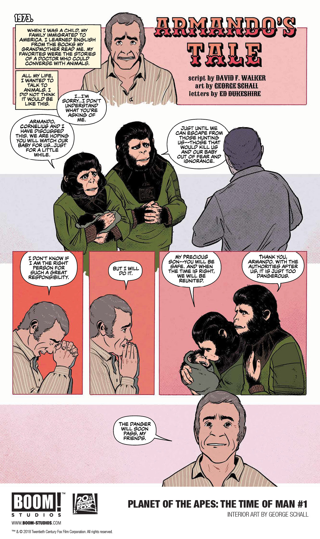 BOOM! Studios unveiled a first look at PLANET OF THE APES: THE TIME OF MAN #1, an all-new special on-sale in October and celebrating the franchise’s historic 50th Anniversary in partnership with 20th Century Fox Consumer Products, with new stories highlighting the Planet of the Apes’ most dangerous enemy: the beast called man! This historic one-shot features stories from both the original films and new series canon, including the early years of Armando and Caesar before Conquest of the Planet of the Apes, and for the first time ever, a story set after the harrowing events of War for the Planet of the Apes, following a few of the remaining human survivors.