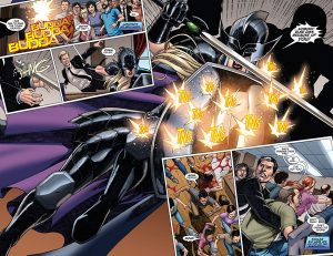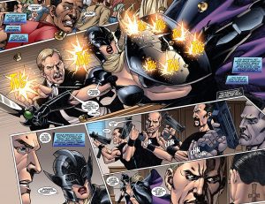 There’s one more point I’d like to point out as praise worthy in the design aspect of The Black Knight. I have kind of a peeve in comics when it comes to women’s footwear, and it drives me a little nuts when I see an action heroine doomed to lifelong arch and ankle problems because she’s forced to go through fight after fight wearing high heels. I’d like to tip my hat to whoever made the decision to give Peyton a decent looking pair of tactical boots. They look like they’ll give her some good support, and the treads on those soles should let her move through puddles of blood on the battlefield without too much slippage.