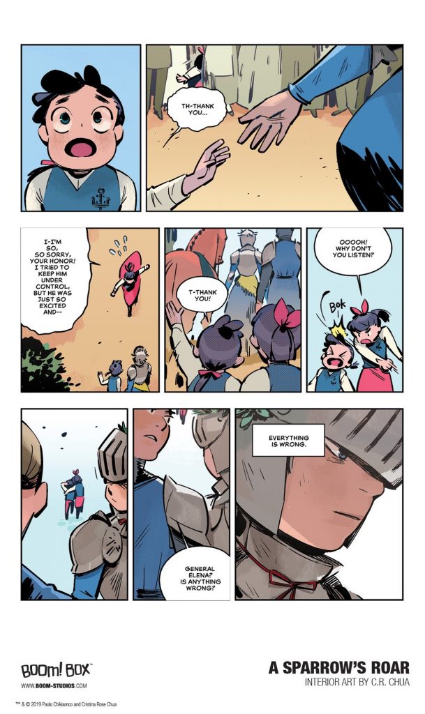 BOOM! Studios revealed a first look at A SPARROW’S ROAR, a brand new original graphic novel from cartoonist C.R. Chua and co-writer Paolo Chikiamco about a young knight who must assume the identity of her sister in order to save her kingdom, in stores October 2019.