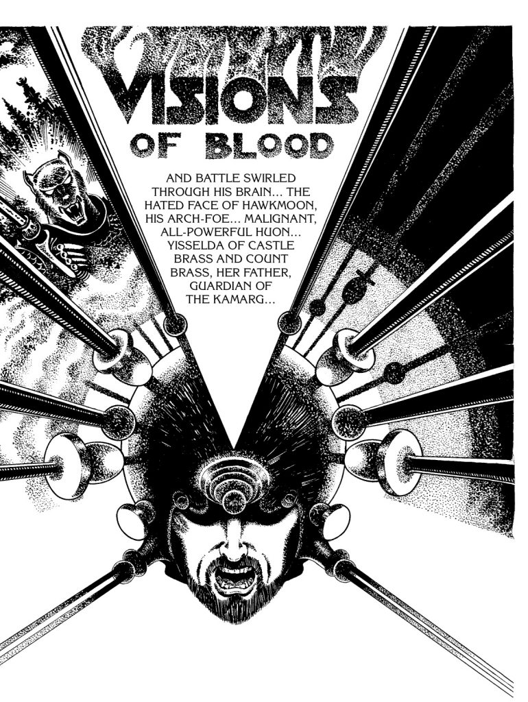 Published for the first time ever – the conclusion to the legendary Hawkmoon Chronicles, written by Michael Moorcock and adapted by James Cawthorn! A saga of science and sorcery 40 years in the telling, illustrated in gorgeous black-and-white with triptych triple-page spreads. In a post-apocalyptic world scoured by monsters and men, only Dorian Hawkmoon can stand against the Dark Empire of Granbretan and its immortal Emperor Huon!