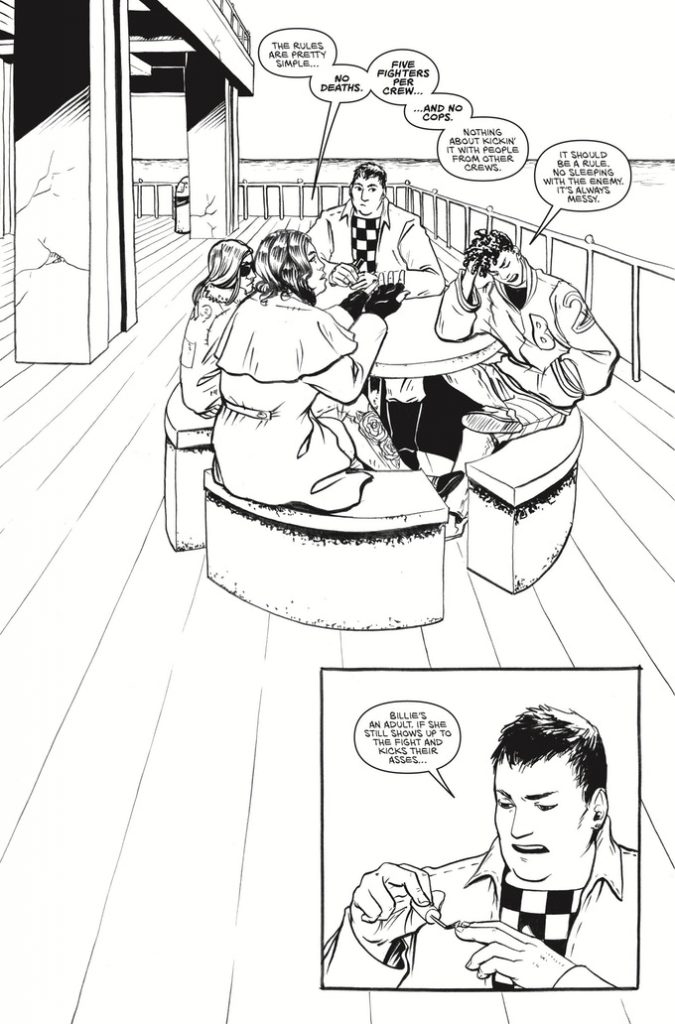 Kickstarter blurb – 20 FISTS is a queer Romeo & Juliet during a break-up meets The Warriors. It’s a tale as old as time. Two women, who met on the battleground, find themselves sorting through the rubble of their relationship in the illegal and unlicensed fight league that runs rampant throughout their city. Issue #1 features two chapters: Round One is the first part of the fight between The No Names & The Big Jackets. Following Round One is a flashback that sets up the growing friction between Chel, Billie, and their crews. This is ultimately a story about doing what you love and not allowing yourself to be controlled by the people in your life. It’s something I think we can all relate to and strive for even if you’ve never been in an underground city-wide fight league