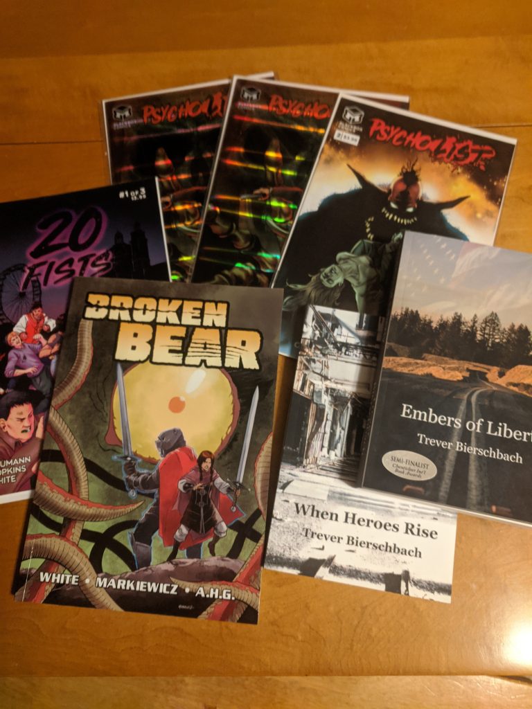 All of these goodies were donated by the creators: Psycholist #1 (2 copies) and #2 [Blackbox Comics], When Heroes Rise and Embers of Freedom [novels from Trever Bierschbach] and Broken Bear and 20 Fists [Frankie White]