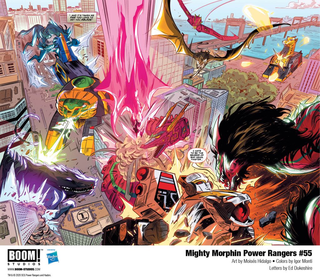 BOOM! Studios, under license by Hasbro, Inc. (NASDAQ: HAS), revealed a first look at the explosive series finale MIGHTY MORPHIN POWER RANGERS #55, from writer Ryan Parrott (Mighty Morphin Power Rangers/Teenage Mutant Ninja Turtles), artist Moisés Hidalgo (Buffy the Vampire Slayer), colorist Igor Monti with assistance by Sabrina Del Grosso, and letterer Ed Dukeshire, featuring the first appearance of the brand new Green Ranger, available on October 21, 2020.