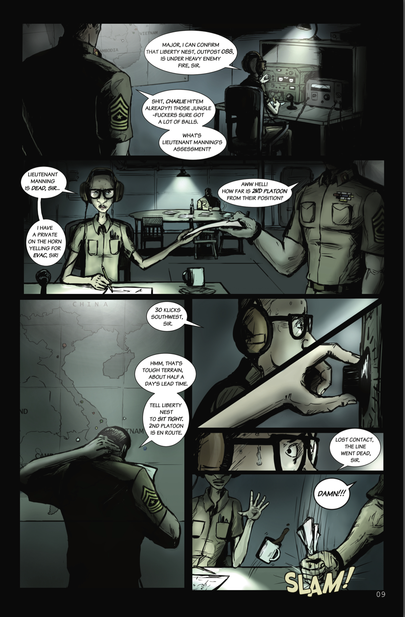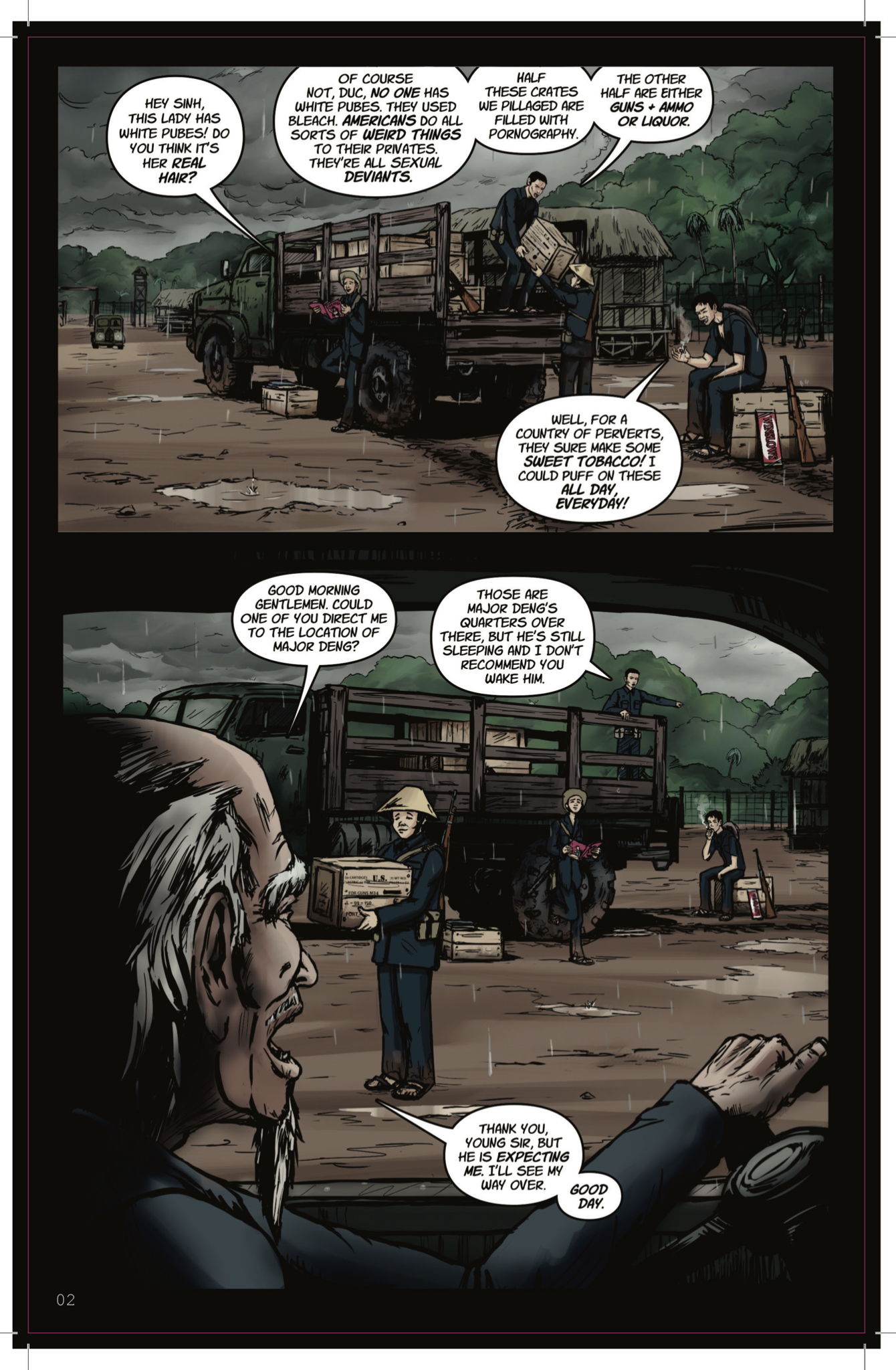In particular, I’m a big fan of the way Shape handles the chatter among the VC enlisted men. He doesn’t bother with trying to make them sound like Vietnamese soldiers, isn’t the least bit interested in pointing out that they’re actually speaking a language other than English, and brilliantly skips trying to put their conversations into some kind of idiotic “pigeon English”. They’re just a bunch of guys hanging out- gambling, joking, talking about their girlfriends & harassing the shit out of each other like soldiers have been doing for as long as there’s been military enlistment. Basically, Shape is treating the Vietnamese soldiers like people, men who were in all likelihood pulled off of their farms, handed a rifle, & pushed into service. That their commanding officer, Major Deng, is a psychopath is a fact of which they’re aware and have no control over whatsoever.