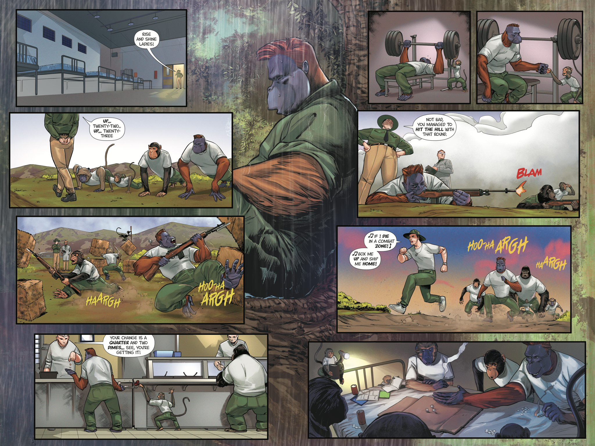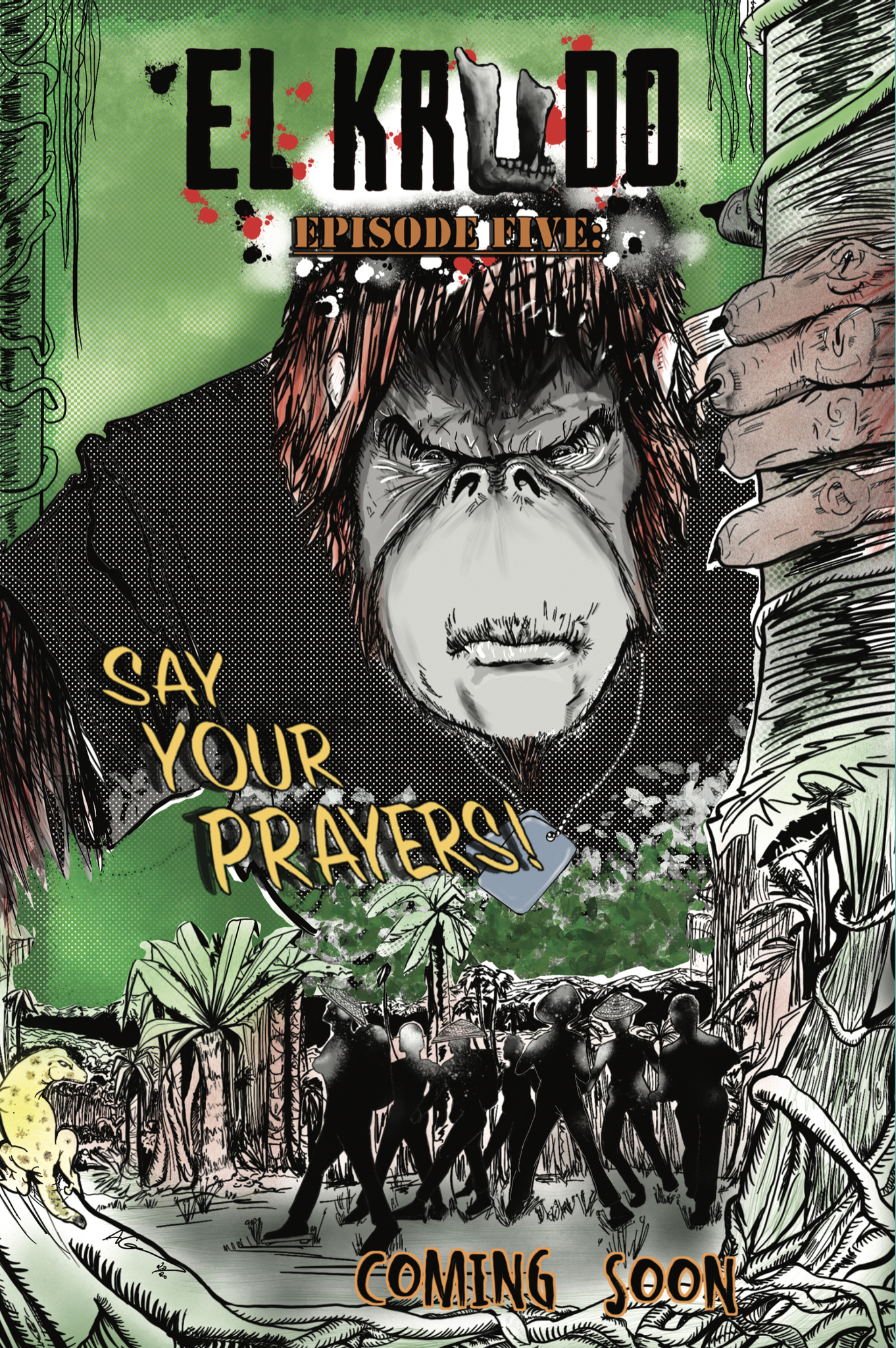 Okay, so El Krudo is an orangutan enlisted in and trained by the United States Marine Corps as a special forces operative. He’s sent in behind enemy lines when an outpost is over run by the Vietcong. He kills some folk, burns down an opium farm (smokes a little bit), and is on a collision course with Major Deng and his VC forces… mostly untested farmboys.