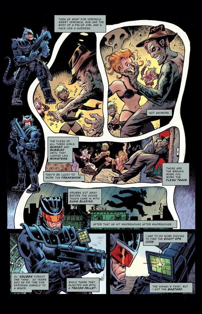 Warlash, an armored warrior of the apocalyptic future, is back. This issue reintroduces Warlash with three tales of hardboiled science fiction crime noir. “The Generator” Warlash goes on the hunt for a missing girl, only to find she has been kidnapped by a super villain who has activated her mutant powers. And in “Grubbs” Warlash goes into the seedy underground sewer system to chase a mutated monster who is devouring people at will, Illustrated by “Stealthy” Steve Mannion.