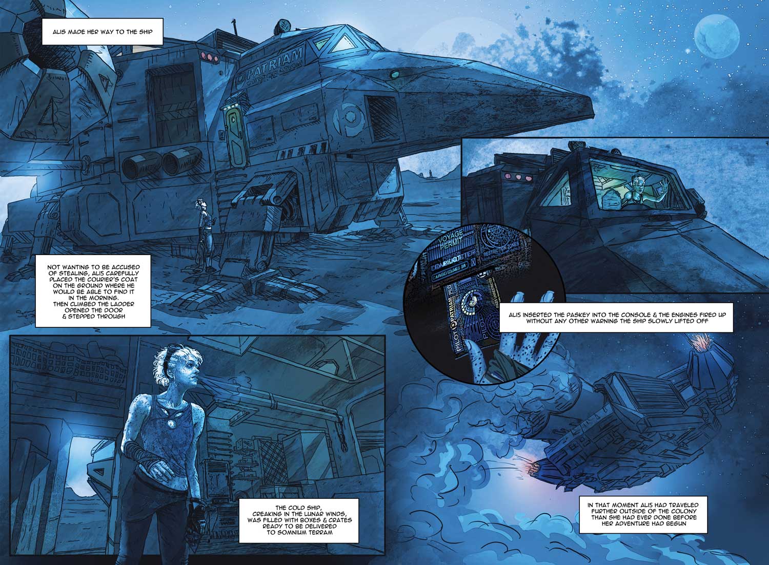 Now, I’m not going to tell you what you should be looking for in your graphic novels, however I am going to say that if I were a betting man, De La Mare’s illustrations are what should be getting all of the attention. “Gorgeous” & “stunning” aren’t generally words that make their way into my daily vocabulary, reserved as they are for really outstanding circumstances, but they’re the adjectives that I keep coming back to when I look at this book. De La Mare’s designs are fantastical & imaginative, from the creatures to their environments, and his titular character AL15 is… well, she’s gorgeous in all of her wide, blue-eyed innocence and courage. It’s the artwork that’s the lynchpin here, tying the story elements of this book together from the standard sequential art of the panels to the pages of illustrated text that give background information on what’s happening.