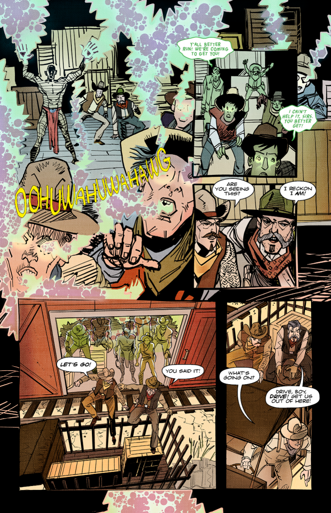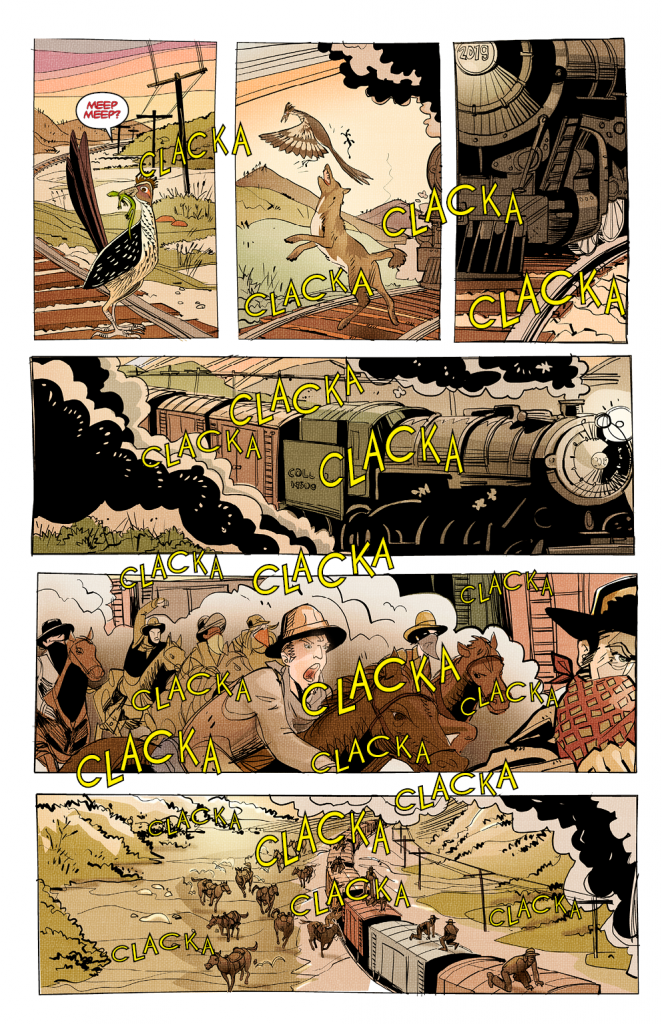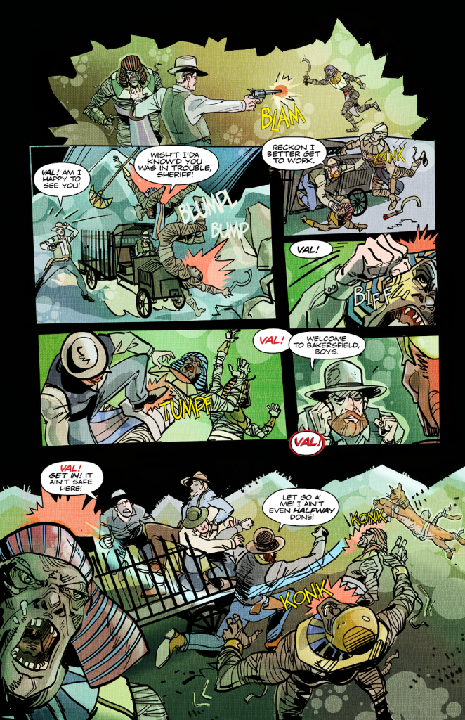 San Francisco, 1919. A mysterious stranger is seen loitering around the Treasures of King Mekhenaten museum exhibit. A few days later, he acts on his near-foolproof plan to rob the exhibit’s train en route to its next destination. While his plan may have been fool-resistant, he did not adequately account for the foolishness of his nephews and fellow outlaws, who accidentally awaken the tyrannical King Mekhenaten’s mummy from its millennia of slumber. When word of the train robbery reaches the Bakersfield sheriff’s office, a posse sets out to apprehend the outlaws and recover the cargo. Out there in the desert, outlaws, lawmen, cursed mummies, a bunch of city-slick longhairs, and a wild half-puma little girl collide in a fast-talkin’, sharp-shootin’, two-fisted adventure wilder than a palomino. Hot Brass, Pharaoh’s Gold first appeared as a digital-only surprise around Christmastime last year, but it’s grown into something bigger, more fun, and still kid-friendly in this Kickstarter exclusive deluxe edition featuring development art and creator commentary (and maybe a surprise or two), and it will be able in both trade paperback and limited edition hardcover formats.