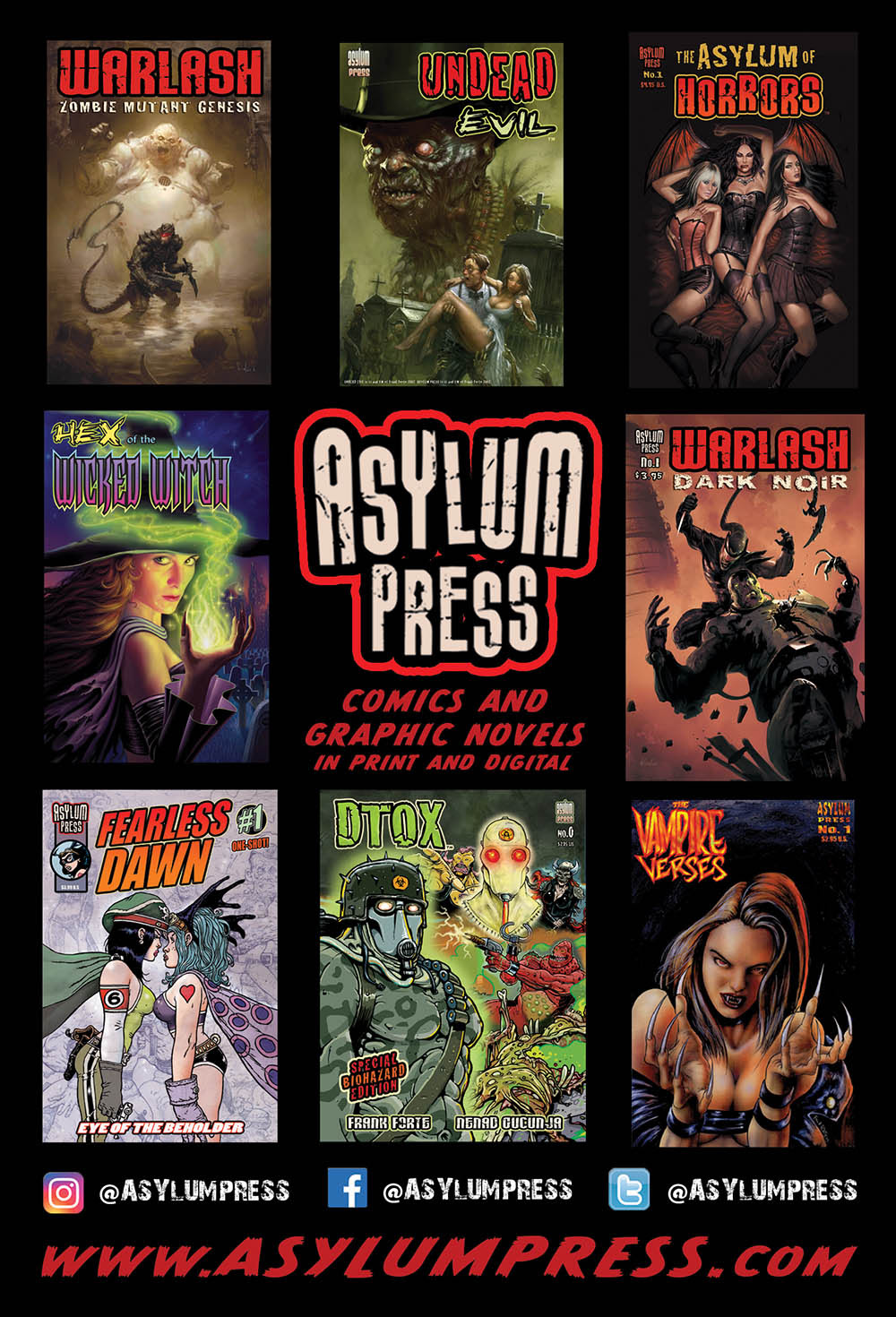 Asylum Press brings you a giant flesh rotting collection of all-new zombie tales. Featuring an international cast of artistic talent. Dwayne Harris brings us “Recluse” where an old man living in a cabin in the woods thinks he’s prepared for the zombie apocalypse. But nothing could prepare him for the bite of a recluse spider turning him into a creature of the undead. In “Nodal”, a man, living in In a post apocalyptic future tries to evade a horde of the lurking dead, but they may not be as dead as they seem; written by Timothy E. Bacon & Grant Fraggalosch and Illustrated by Timothy E. Bacon . ” I describe Nodal as a zombie story in the style of Tetsuo: The Iron Man meets Videodrome, ” explains creator Timothy E. Bacon. “Abomination Dead” is written and Illustrated by Frank Forte (Warlash, Vampire Macabre) In “The Trapped Undead”” a yojimbo must fight off a gambling hall bursting with the living dead, written and illustrated by Brian Quinn (@MRDRfly).