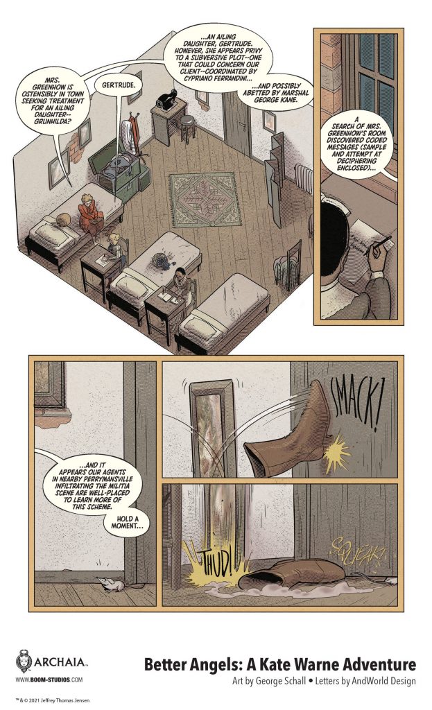 BOOM! Studios today revealed a new extended look at the brand new original graphic novel BETTER ANGELS: A KATE WARNE ADVENTURE, from Emmy and Eisner Award-winning writer Jeff Jensen (HBO’s Watchmen, Green River Killer: A True Detective Story) and acclaimed artist George Schall (Made In Korea), inspired by the true story of Kate Warne, America’s first woman detective, and her singular achievement—thwarting a plot by Confederate radicals to kill Abraham Lincoln.