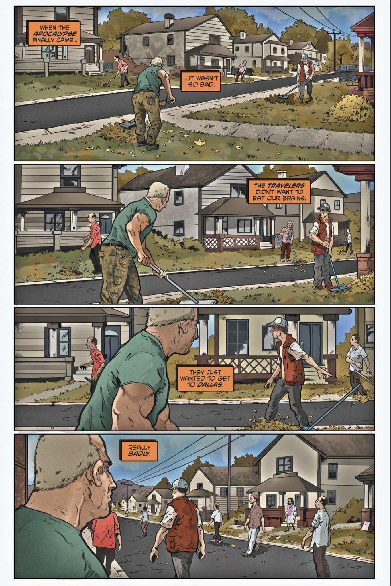 Okay, on the surface this might not really be one of those books that leaps off of the shelf and into your arms. To some, it might sound like a clone of The Walking Dead hoping to ride that fine title’s coattails to success. To others it could come across as some kind of bizarre concept piece commenting on the dangers of herd mentality. Neither line of thought really touches on just how cool By the Time I Get to Dallas really is.