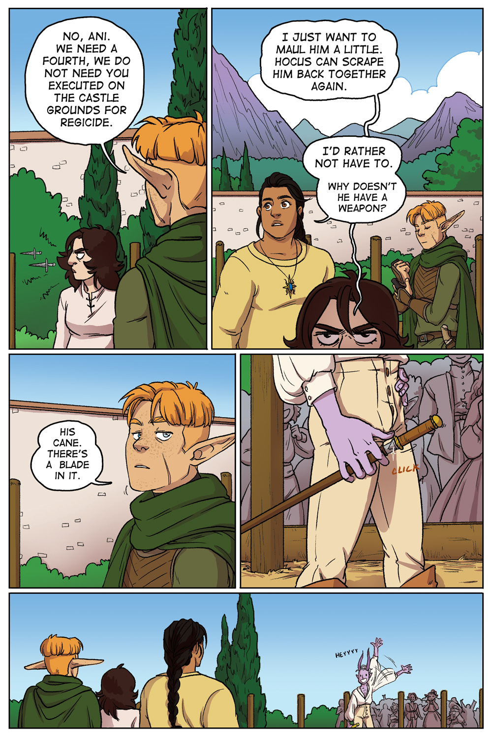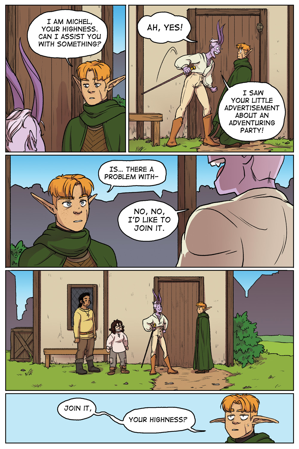 People are going missing in a small mountain town. The city guard are blocked from a real investigation. The notorious Underguild has assigned Michel a secret mission: find the missing villagers and bring whatever kidnapped them to justice. Unfortunately for Michel (and his fellow adventurers, Ani and Hocus), they’re short a fighter and need one more party member to foil this plot. Even more unfortunately, the only volunteer seems to be the arrogant, ostentatious, purple playboy Prince Eugene looking to cure his boredom. Covert is not a concept that he’s familiar with, and let’s just say his commitment to the mission is questionable.