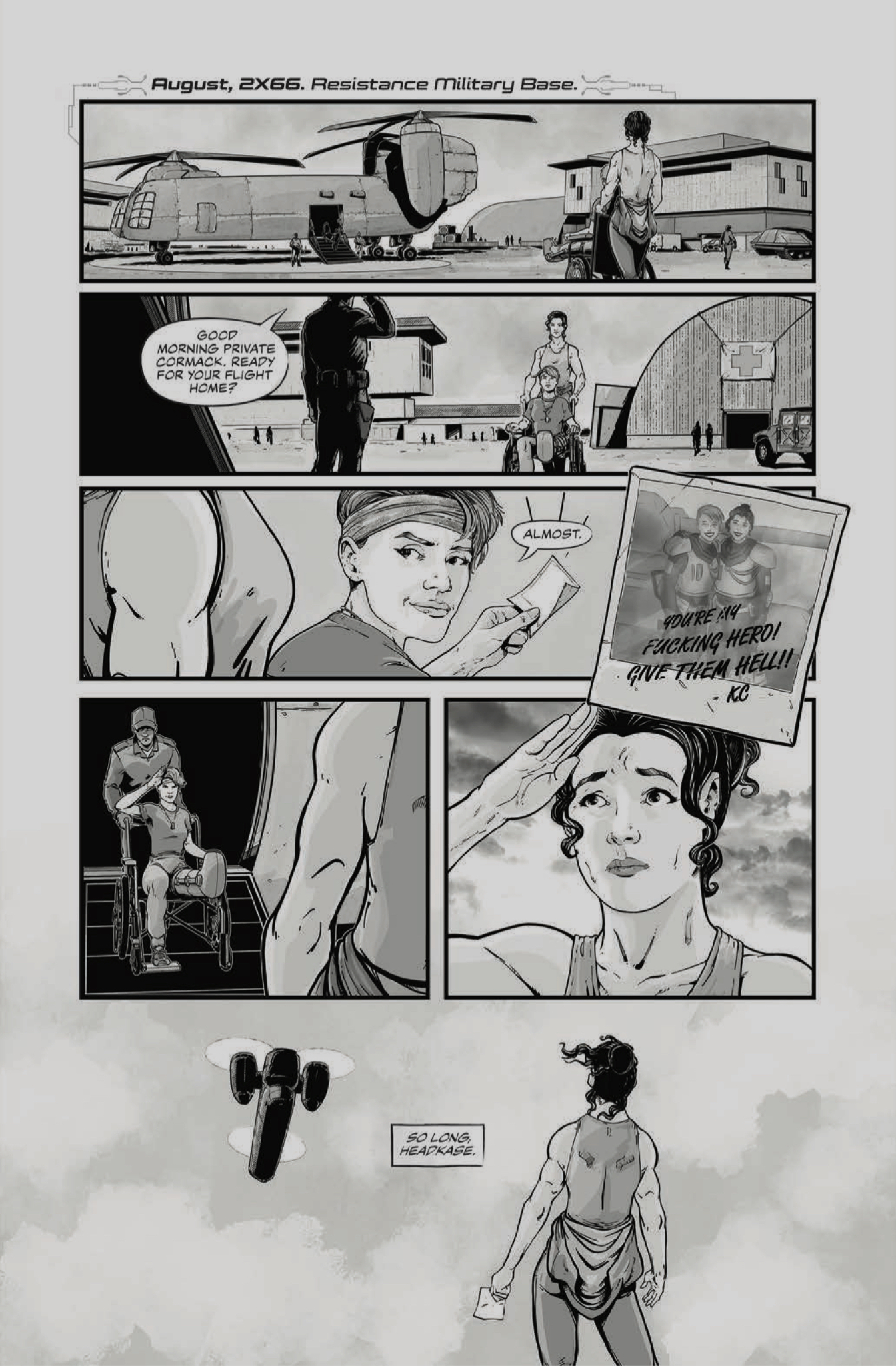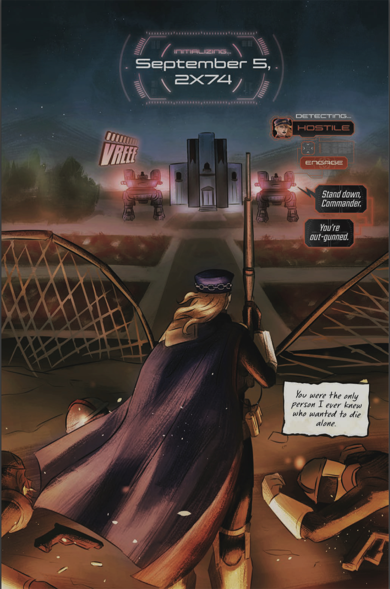 My biggest regret is that this is a one-shot, because it would be great to take deeper dive into this “dystopian sci fi” world Fell Hound has created. There’s a lot of story to tell about Commander Rao and her personal war, the in between times from her leaving the Resistance military to her final stand against the Baron. The 5 page bonus story, End of the Line beautifully illustrated by Jeremy Simser, is just a drop in that very huge bucket, only serving to whet the appetite for more. With this blend of character & action-driven story, possibilities abound for fans of military sci fi and anime inspired action.