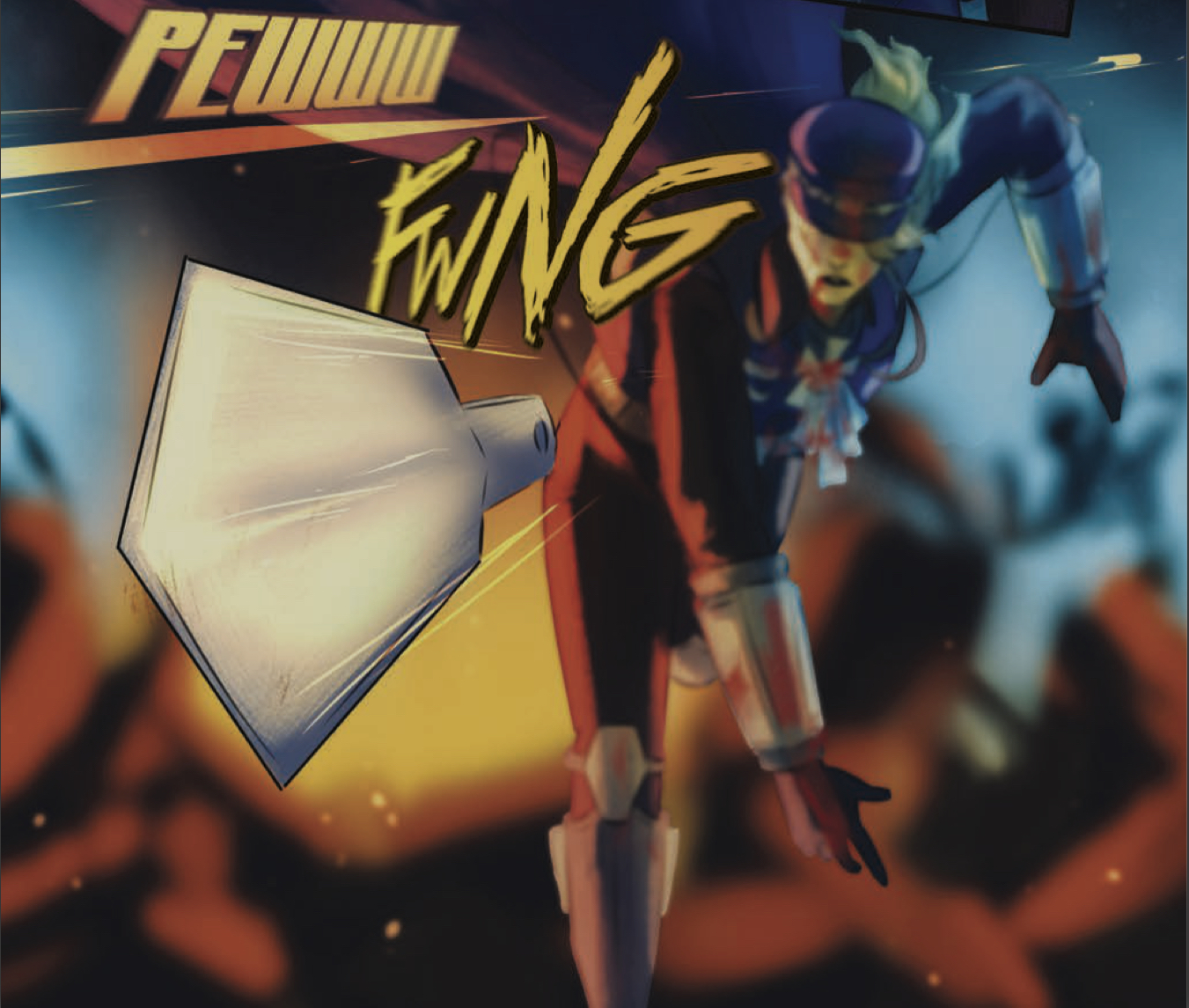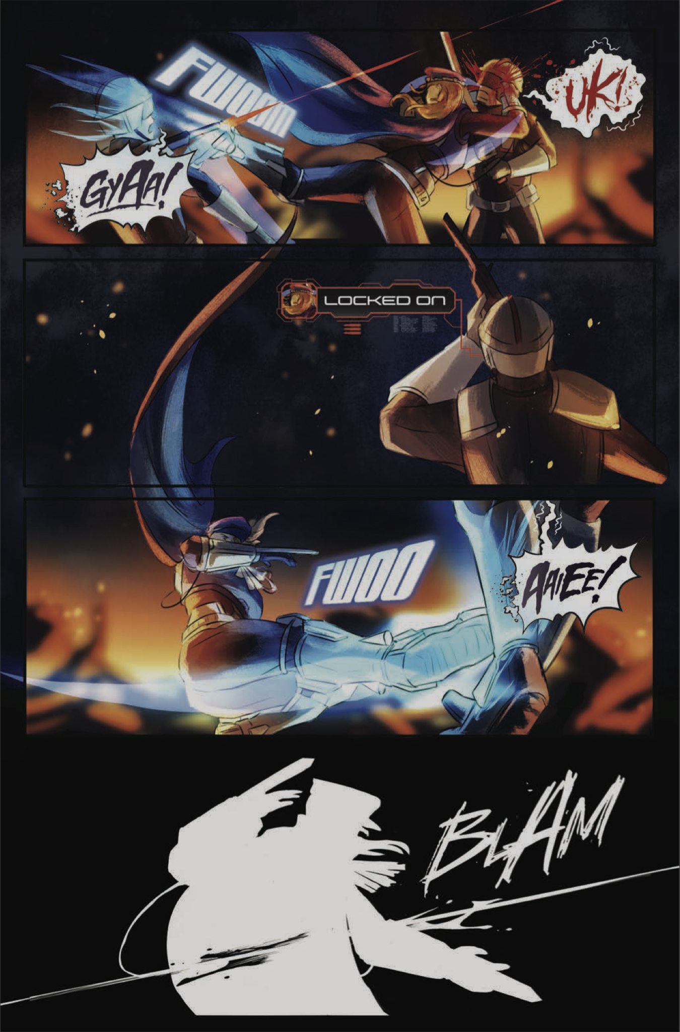 Without a doubt, Commander Rao is visually driven. Fell Hound approached her original story with the idea of an action scene being one continuous sequence flowing across the pages. I’d like to report that regard, the finished product is a success! Fell Hound has a great handle on design when it comes to choreographing action. There are great examples of how opening up traditional panel arrangements and using different angles to help show motion. Paired with awesome use of blur effects and an obvious love for the anime that was one of her influences in the story, Fell Hound’s out of control “practice” piece is a hit.