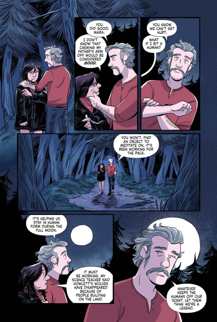 The artwork for WereWoofs was the first clue that this wasn’t going to be a standard werewolf story. Val Wise uses a pretty mellow, more cartoony style that works to keep the tone light, even through some of the darker story elements. However, while the look may indicate a younger target audience to some, that isn’t necessarily the case as we start digging into the disappearance of Mara’s dad. Taking a gander at some of his other work, it’s plain to see that Wise has a gift for hiding darker and more adult themes in a style that looks like it’d fit in a children’s book at first glance. Where I thought Wise’s touch really sold the book was in the more subtle sight gags and the way he casually/humorously anthropomorphizes the lycanthropically challenged kids.